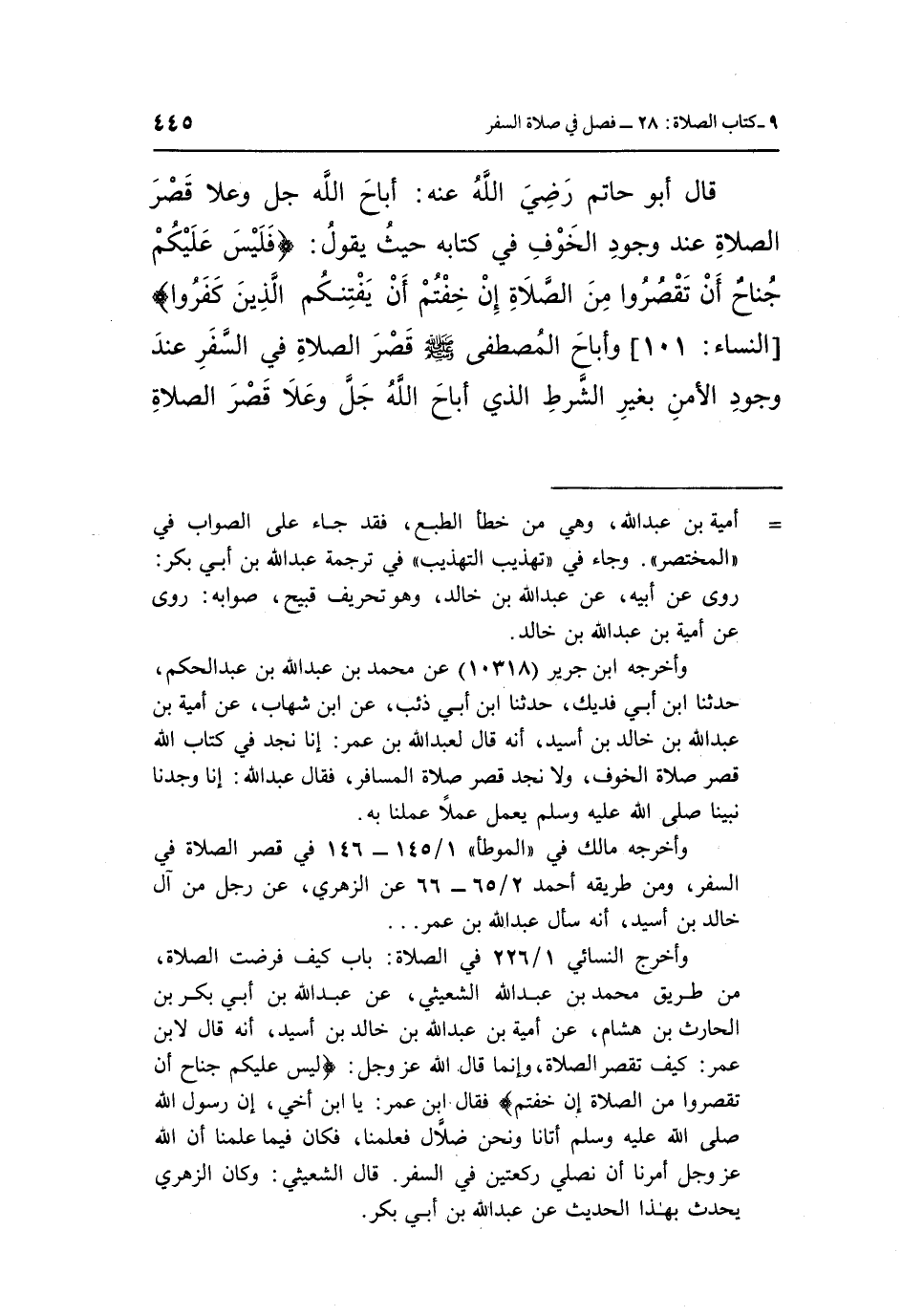 وأخرج النسائي 1/226 في الصلاة: باب كيف فرضت الصلاة، من طريق محمد بن عبد الله الشعيثي، عن عبد الله بن أبي بكر بن الحارث بن هشام، عن أمية بن عبد الله بن خالد بن أسيد، أنه قال لابن عمر: كيف تقصر الصلاة، وإنما قال. الله عز وجل: {ليس عليكم جناح أن تقصروا من الصلاة إن خفتم} فقال ابن عمر: يا ابن أخي، إن رسول الله صلى الله عليه وسلم أتانا ونحن ضلَّال فعلمنا، فكان فيما علمنا أن الله عز وجل أمرنا أن نصلي ركعتين في السفر. قال الشعيثي: وكان الزهري يحدث بهذا الحديث عن عبد الله بن أبي بكر.