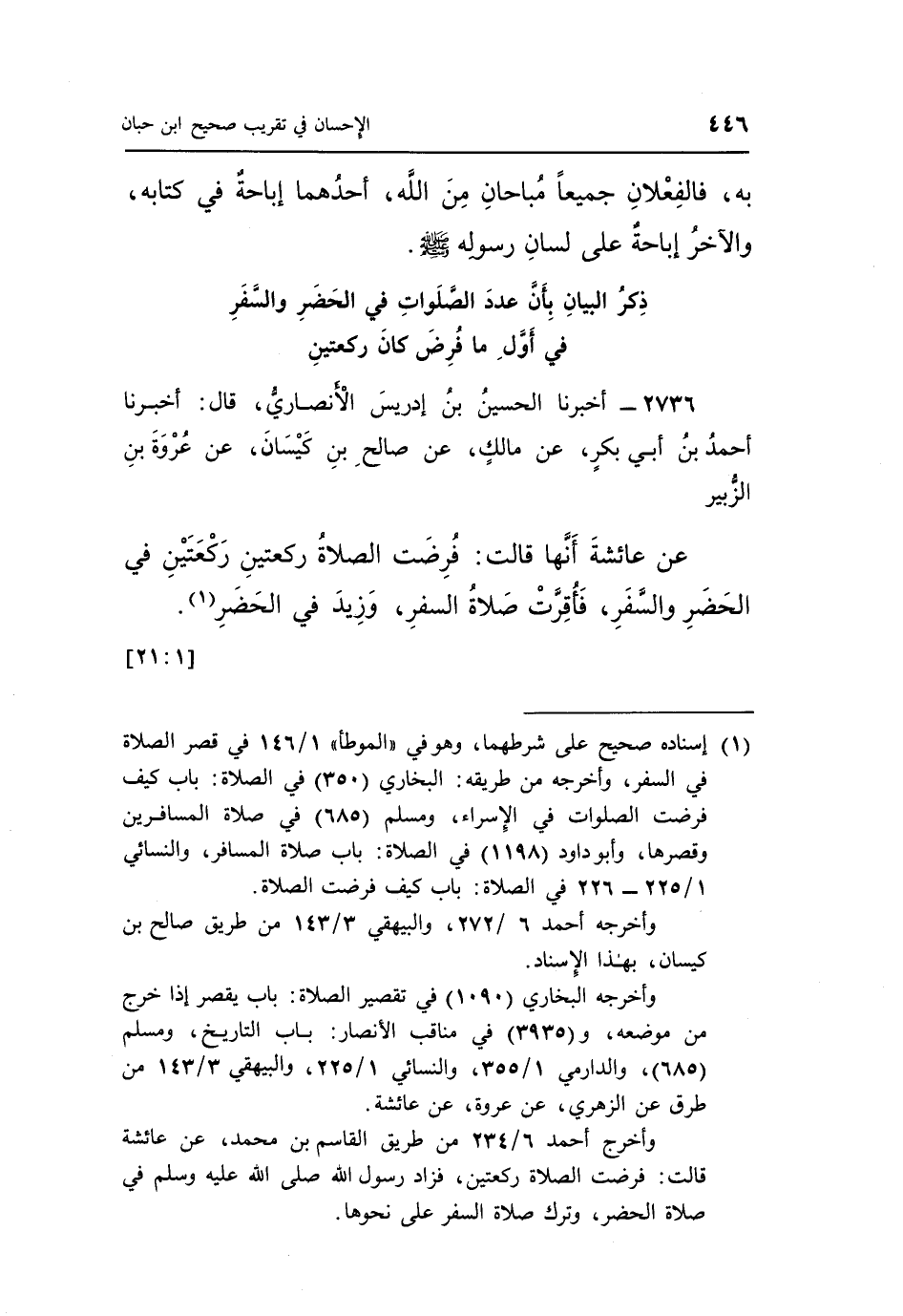 2736 - أَخْبَرَنَا الْحُسَيْنُ بْنُ إِدْرِيسَ الْأَنْصَارِيُّ، قَالَ: أَخْبَرَنَا أَحْمَدُ بْنُ أَبِي بَكْرٍ، عَنْ مَالِكٍ، عَنْ صَالِحِ بْنِ كَيْسَانَ، عَنْ عُرْوَةَ بْنِ الزُّبَيْرِ، عَنْ عَائِشَةَ، أَنَّهَا قَالَتْ: «فُرِضَتِ الصَّلَاةُ رَكْعَتَيْنِ رَكْعَتَيْنِ فِي الْحَضَرِ وَالسَّفَرِ، فَأُقِرَّتْ صَلَاةُ السَّفَرِ وَزِيدَ فِي الْحَضَرِ» (¬1) . [1: 21]
