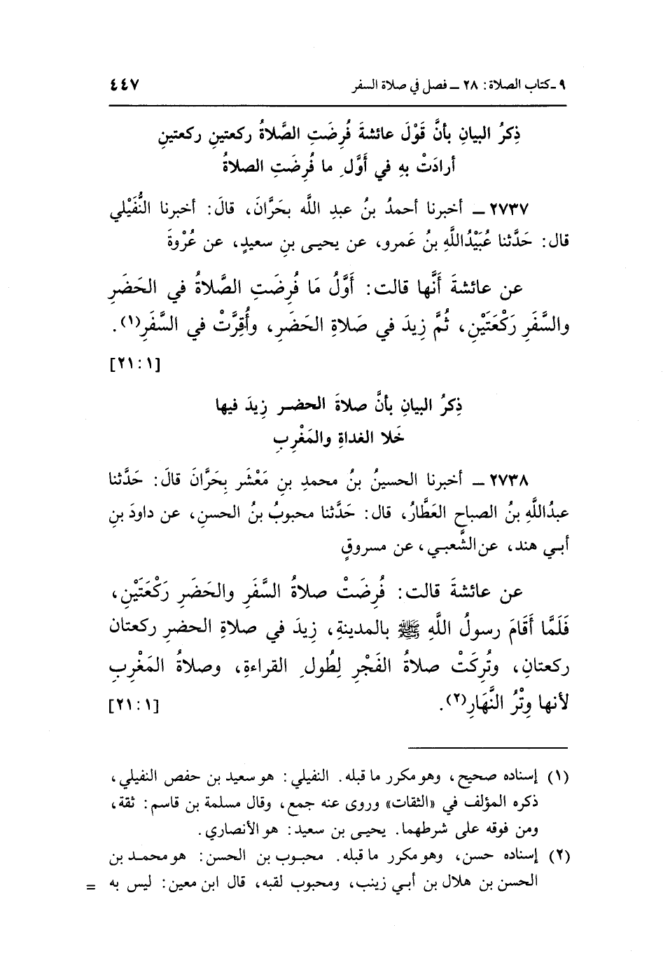 2737 - أَخْبَرَنَا أَحْمَدُ بْنُ عَبْدِ اللَّهِ بِحَرَّانَ، قَالَ: أَخْبَرَنَا النُّفَيْلِيُّ، قَالَ: حَدَّثَنَا عُبَيْدُ اللَّهِ بْنُ عَمْرٍو، عَنْ يَحْيَى بْنِ سَعِيدٍ، عَنْ عُرْوَةَ، عَنْ عَائِشَةَ، أَنَّهَا قَالَتْ: «أَوَّلُ مَا فُرِضَتِ الصَّلَاةُ فِي الْحَضَرِ وَالسَّفَرِ رَكْعَتَيْنِ، ثُمَّ زِيدَ فِي صَلَاةِ الْحَضَرِ، وَأُقِرَّتْ فِي السَّفَرِ» (¬1) . [1: 21]