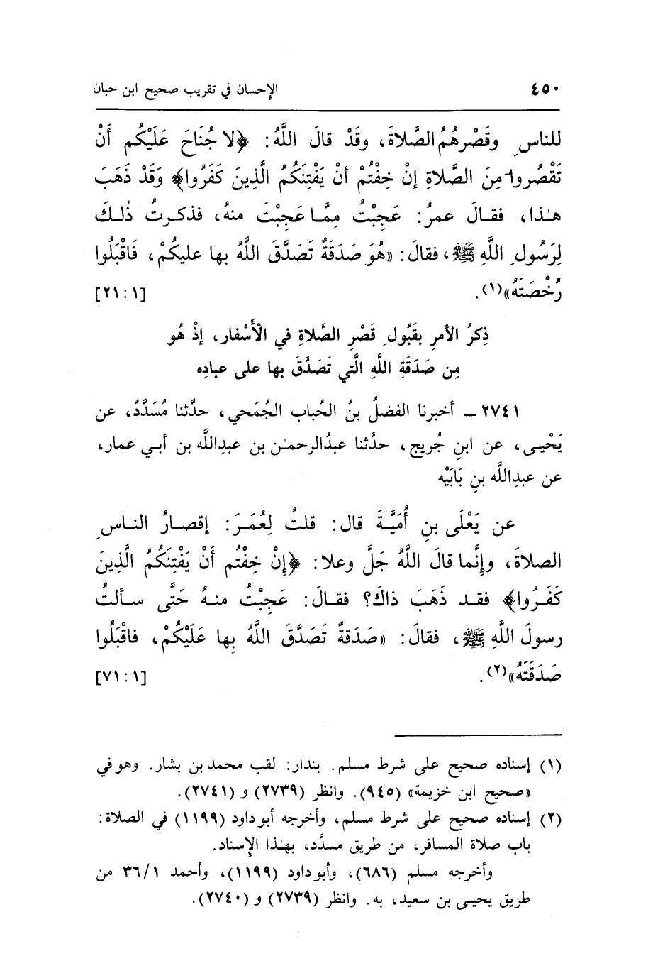 2741 - أَخْبَرَنَا الْفَضْلُ بْنُ الْحُبَابِ الْجُمَحِيُّ، حَدَّثَنَا مُسَدَّدٌ، عَنْ يَحْيَى، عَنِ ابْنِ جُرَيْجٍ، حَدَّثَنَا عَبْدُ الرَّحْمَنِ بْنُ عَبْدِ اللَّهِ بْنِ أَبِي عَمَّارٍ، عَنْ عَبْدِ اللَّهِ بْنِ بَابَيْهِ، عَنْ يَعْلَى بْنِ أُمَيَّةَ، قَالَ: قُلْتُ لِعُمَرَ: إِقْصَارُ النَّاسِ الصَّلَاةَ وَإِنَّمَا قَالَ اللَّهُ جَلَّ وَعَلَا: {إِنْ خِفْتُمْ أَنْ يَفْتِنَكُمُ الَّذِينَ كَفَرُوا} ، فَقَدْ ذَهَبَ ذَاكَ، فَقَالَ: عَجِبْتُ مِنْهُ حَتَّى سَأَلْتُ رَسُولَ اللَّهِ صَلَّى اللَّهُ عَلَيْهِ وَسَلَّمَ، فَقَالَ: «صَدَقَةٌ تَصَدَّقَ اللَّهُ بِهَا عَلَيْكُمْ، فَاقْبَلُوا صَدَقَتَهُ» (¬2) . [1: 71]