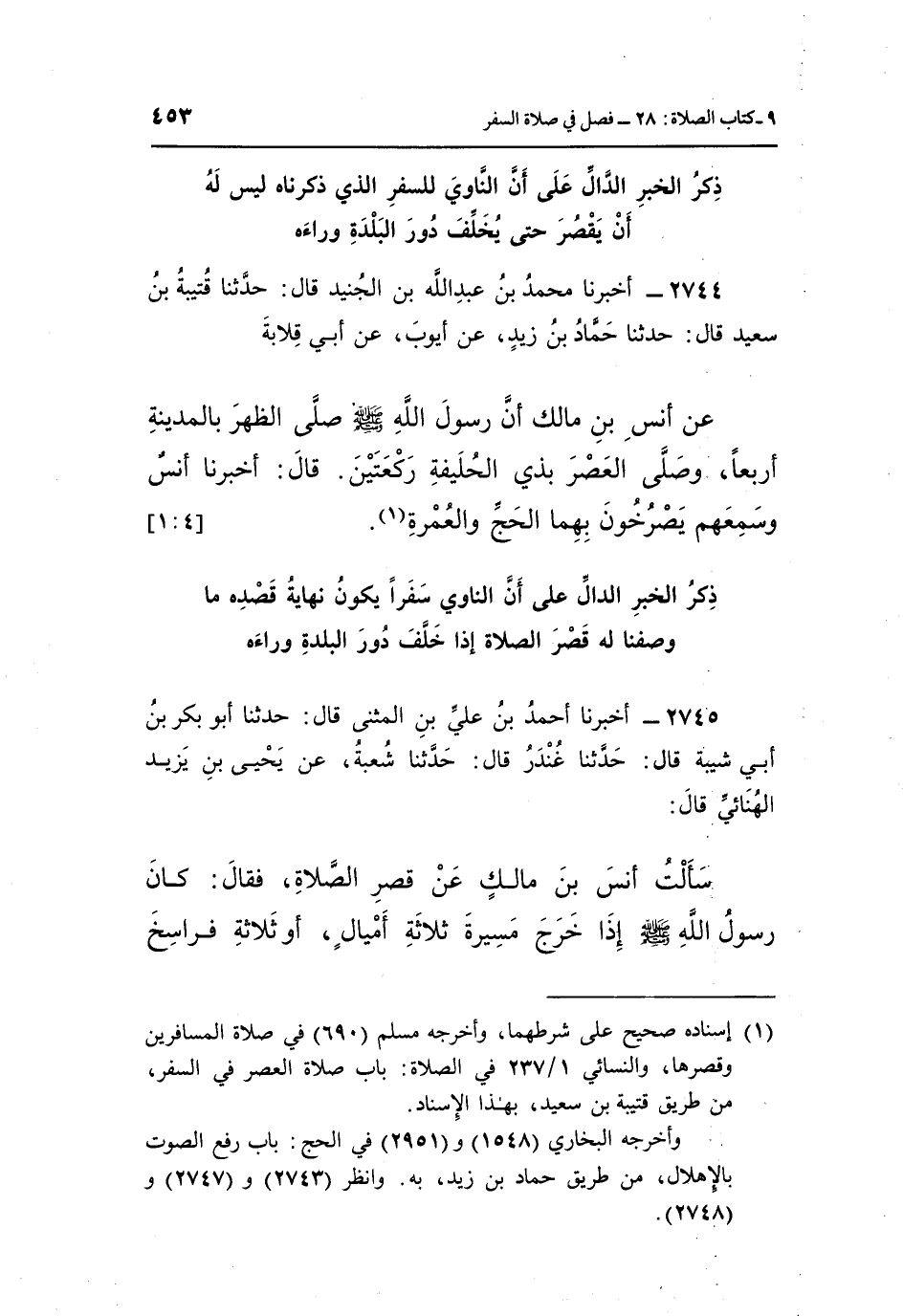 2744 - أَخْبَرَنَا مُحَمَّدُ بْنُ عَبْدِ اللَّهِ بْنِ الْجُنَيْدِ، قَالَ: حَدَّثَنَا قُتَيْبَةُ بْنُ سَعِيدٍ، قَالَ: حَدَّثَنَا حَمَّادُ بْنُ زَيْدٍ، عَنْ أَيُّوبَ، عَنْ أَبِي قِلَابَةَ، عَنْ أَنَسِ بْنِ مَالِكٍ، «أَنَّ رَسُولَ اللَّهِ صَلَّى اللَّهُ عَلَيْهِ وَسَلَّمَ صَلَّى الظُّهْرَ بِالْمَدِينَةِ أَرْبَعًا، وَصَلَّى الْعَصْرَ بِذِي الْحُلَيْفَةِ رَكْعَتَيْنِ» ، قَالَ: أَخْبَرَنَا أَنَسٌ «وَسَمِعَهُمْ يَصْرُخُونَ بِهِمَا الْحَجَّ وَالْعُمْرَةَ» (¬1) . [4: 1]