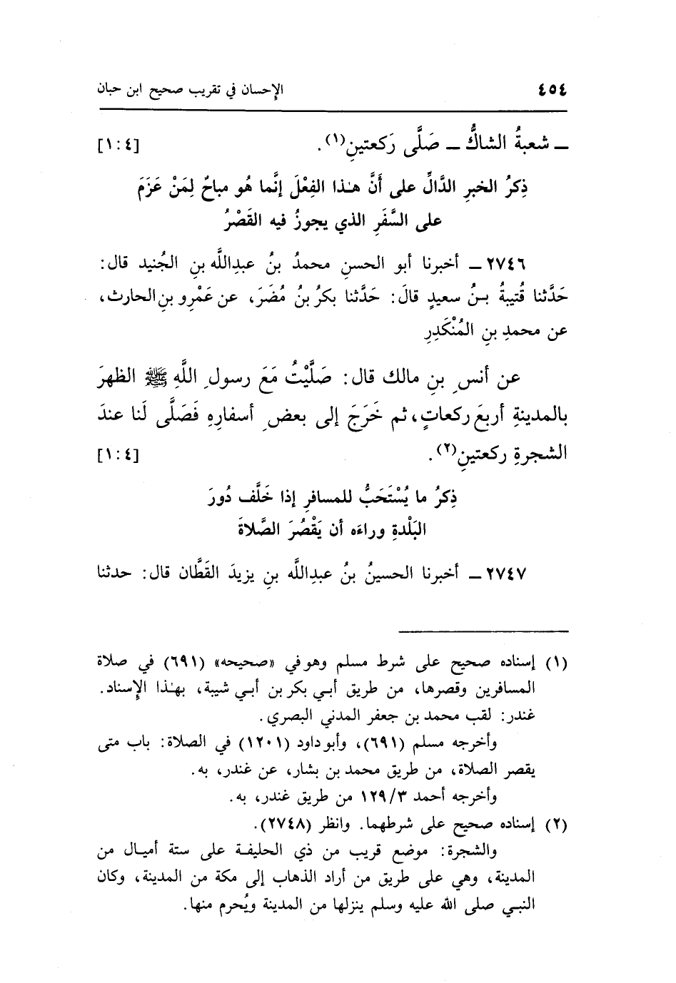 2746 - أَخْبَرَنَا أَبُو الْحَسَنِ مُحَمَّدُ بْنُ عَبْدِ اللَّهِ بْنِ الْجُنَيْدِ، قَالَ: حَدَّثَنَا قُتَيْبَةُ بْنُ سَعِيدٍ، قَالَ: حَدَّثَنَا بَكْرُ بْنُ مُضَرَ، عَنْ عَمْرِو بْنِ الْحَارِثِ، عَنْ مُحَمَّدِ بْنِ الْمُنْكَدِرِ، عَنْ أَنَسِ بْنِ مَالِكٍ، قَالَ: «صَلَّيْتُ مَعَ رَسُولِ اللَّهِ صَلَّى اللَّهُ عَلَيْهِ وَسَلَّمَ الظُّهْرَ بِالْمَدِينَةِ أَرْبَعَ رَكَعَاتٍ، ثُمَّ خَرَجَ إِلَى بَعْضِ أَسْفَارِهِ فَصَلَّى لَنَا عِنْدَ الشَّجَرَةِ رَكْعَتَيْنِ» (¬2) . [4: 1]