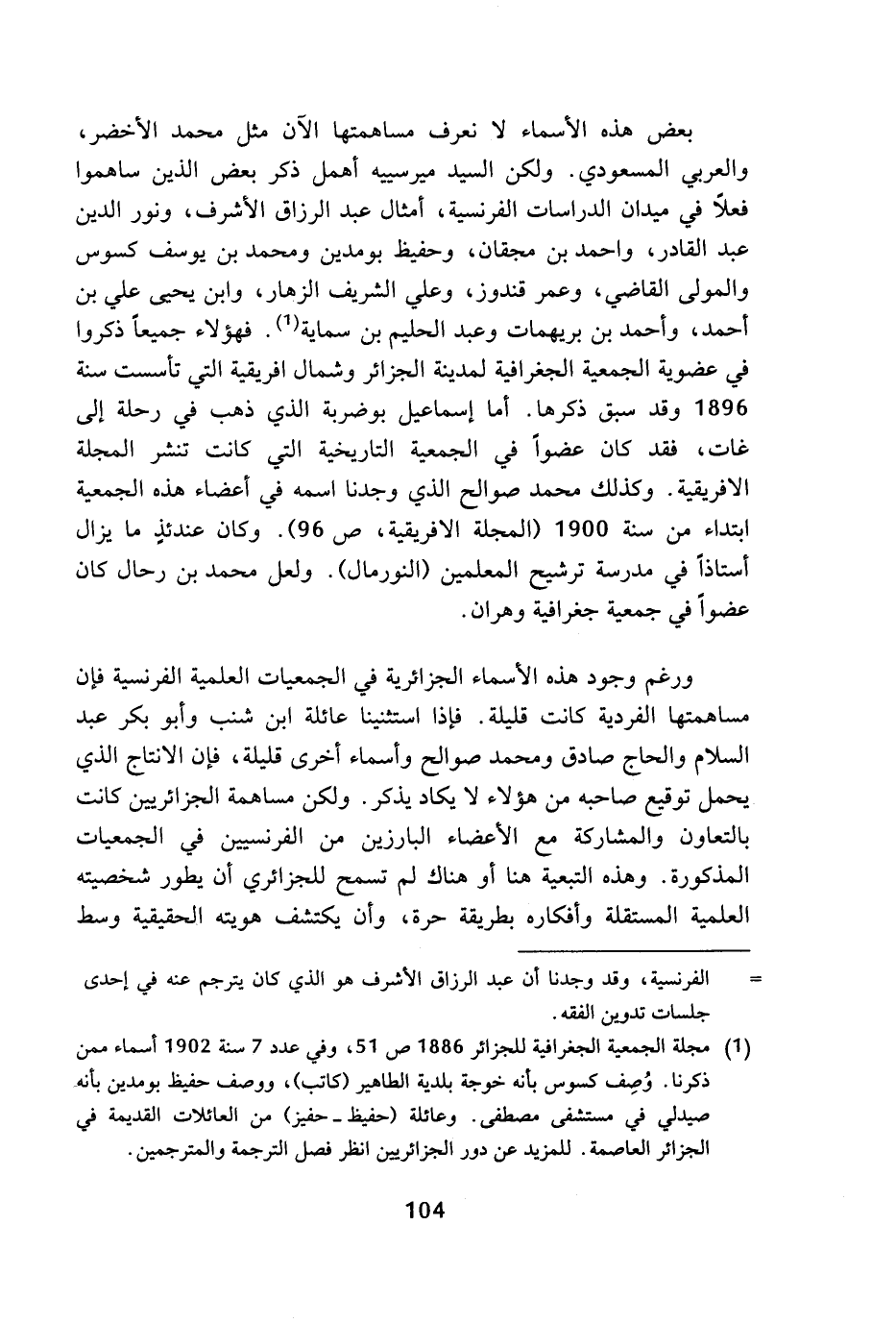 بعض هذه الأسماء لا نعرف مساهمتها الآن مثل محمد الأخضر، والعربي المسعودي. ولكن السيد ميرسييه أهمل ذكر بعض الذين ساهموا فعلا في ميدان الدراسات الفرنسية، أمثال عبد الرزاق الأشرف، ونور الدين عبد القادر، واحمد بن مجقان، وحفيظ بومدين ومحمد بن يوسف كسوس والمولى القاضي، وعمر قندوز، وعلي الشريف الزهار، وابن يحيى علي بن أحمد، وأحمد بن بريهمات وعبد الحليم بن سماية (¬1). فهؤلاء جميعا ذكروا في عضوية الجمعية الجغرافية لمدينة الجزائر وشمال افريقية التي تأسست سنة 1896 وقد سبق ذكرها. أما إسماعيل بوضربة الذي ذهب في رحلة إلى غات، فقد كان عضوا في الجمعية التاريخية التي كانت تنشر المجلة الافريقية. وكذلك محمد صوالح الذي وجدنا اسمه في أعضاء هذه الجمعية ابتداء من سنة 1900 (المجلة الافريقية، ص 96). وكان عندئذ ما يزال أستاذا في مدرسة ترشيح المعلمين (النورمال). ولعل محمد بن رحال كان عضوا في جمعية جغرافية وهران.