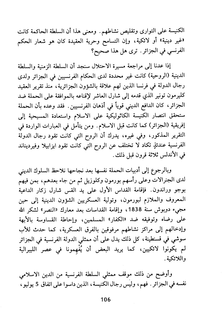 الكنيسة على التوارى وتقليص نشاطهم. ومعنى هذا أن السلطة الحاكمة كانت (غير دينية) أو لائكية، وإن التسامح وحرية العقيدة كان هو شعار الحكم الفرنسي في الجزائر. ترى هل هذا صحيح؟
