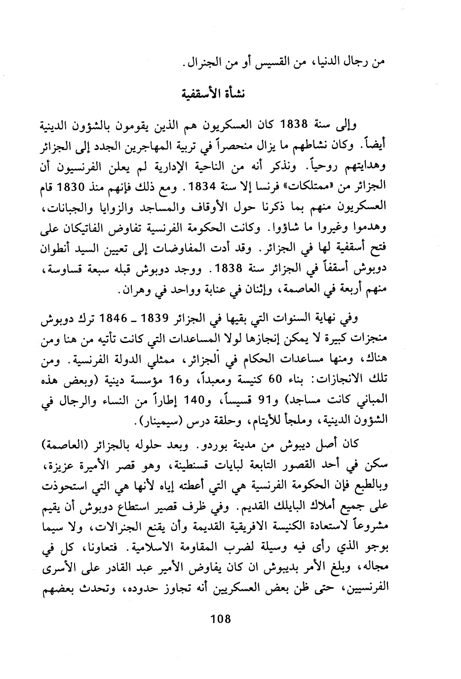 وإلى سنة 1838 كان العسكريون هم الذين يقومون بالشؤون الدينية أيضا. وكان نشاطهم ما يزال منحصرا في تربية المهاجرين الجدد إلى الجزائر وهدايتهم روحيا. ونذكر أنه من الناحية الإدارية لم يعلن الفرنسيون أن الجزائر من (ممتلكات) فرنسا إلا سنة 1834. ومع ذلك فإنهم منذ 1830 قام العسكريون منهم بما ذكرنا حول الأوقاف والمساجد والزوايا والجبانات، وهدموا وغيروا ما شاؤوا. وكانت الحكومة الفرنسية تفاوض الفاتيكان على فتح أسقفية لها في الجزائر. وقد أدت المفاوضات إلى تعيين السيد أنطوان دوبوش أسقفا في الجزائر سنة 1838. ووجد دوبوش قبله سبعة قساوسة، منهم أربعة في العاصمة، وإثنان في عنابة وواحد في وهران.