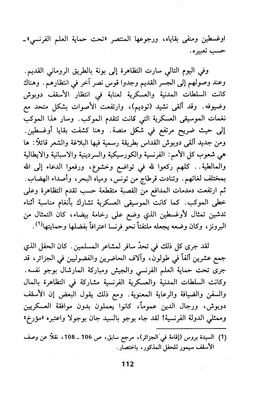 (¬1) السيدة بروس (إقامة في الجزائر)، مرجع سابق، ص 106 - 108، نقلا عن وصف الأسقف سيمور للحفل المذكور، باختصار.