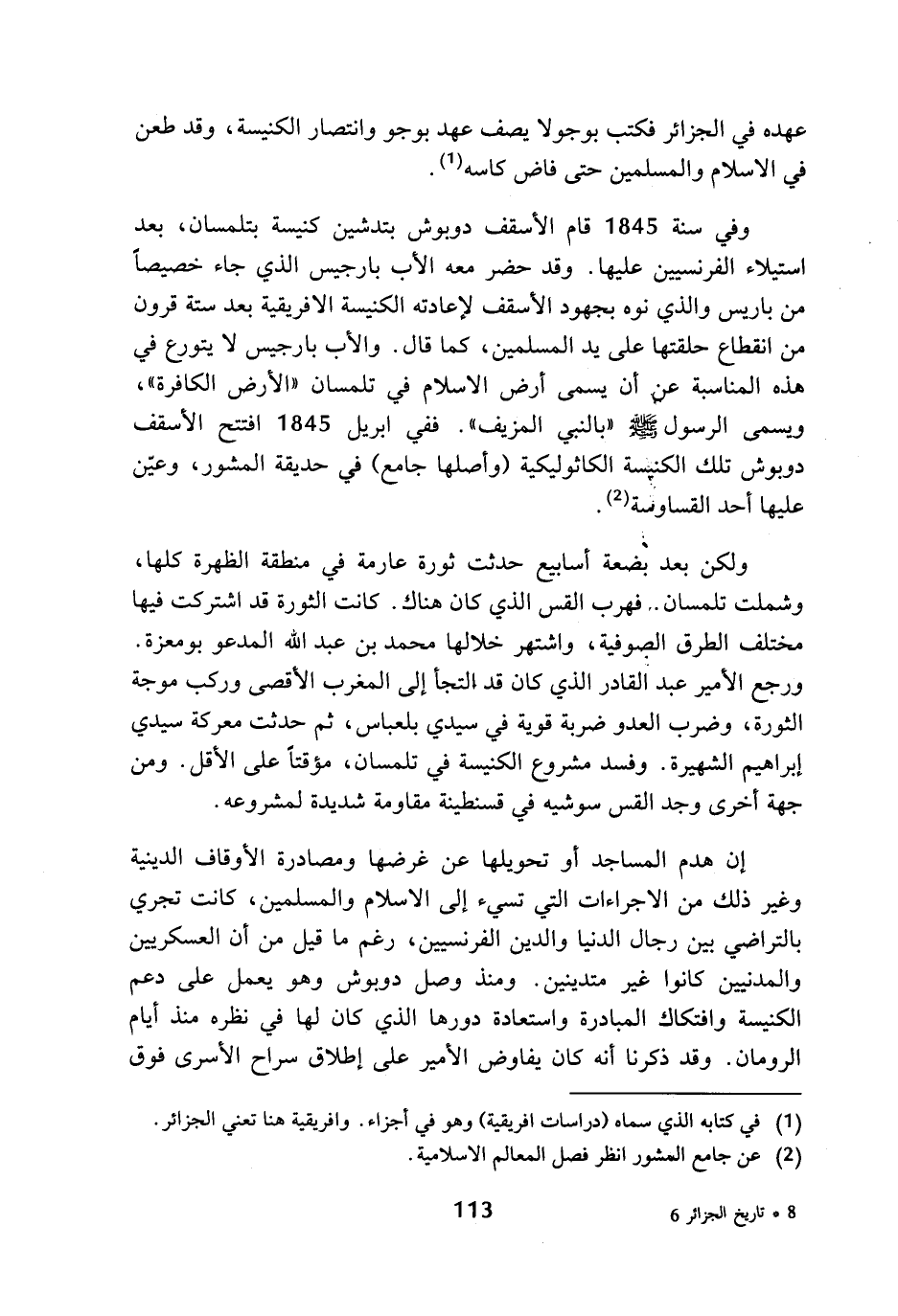إن هدم المساجد أو تحويلها عن غرضها ومصادرة الأوقاف الدينية وغير ذلك من الاجراءات التي تسيء إلى الاسلام والمسلمين، كانت تجري بالتراضي بين رجال الدنيا والدين الفرنسيين، رغم ما قيل من أن العسكريين والمدنيين كانوا غير متدينين. ومنذ وصل دوبوش وهو يعمل على دعم الكنيسة وافتكاك المبادرة واستعادة دورها الذي كان لها في نظره منذ أيام الرومان. وقد ذكرنا أنه كان يفاوض الأمير على إطلاق سراح الأسرى فوق