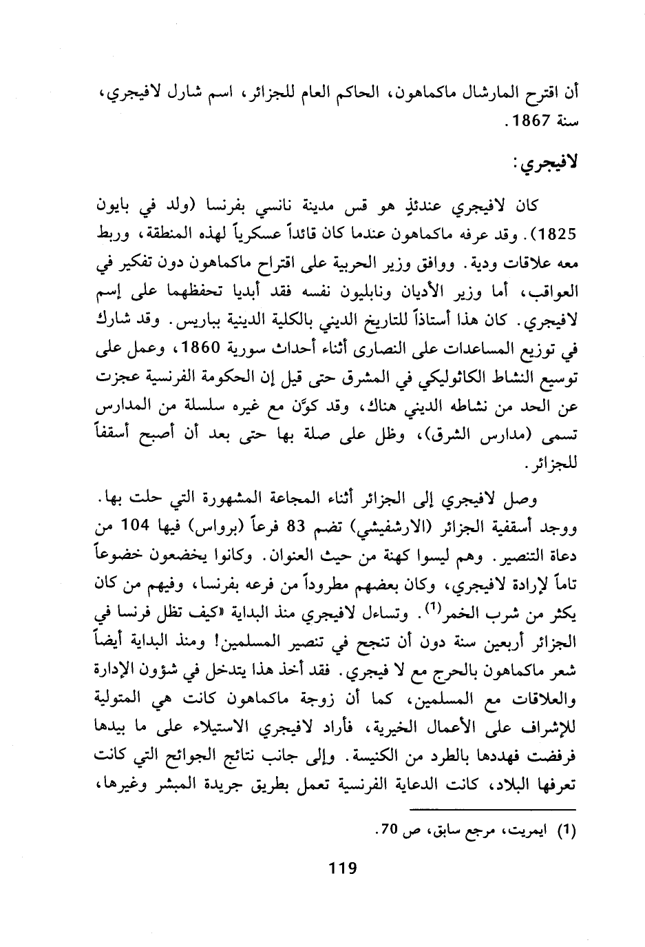 كان لافيجري عندئذ هو قس مدينة نانسي بفرنسا (ولد في بايون 1825). وقد عرفه ماكماهون عندما كان قائدا عسكريا لهذه المنطقة، وربط معه علاقات ودية. ووافق وزير الحربية على اقتراح ماكماهون دون تفكير في العواقب، أما وزير الأديان ونابليون نفسه فقد أبديا تحفظهما على إسم لافيجري. كان هذا أستاذا للتاريخ الديني بالكلية الدينية بباريس. وقد شارك في توزيع المساعدات على النصارى أثناء أحداث سورية 1860، وعمل على توسيع النشاط الكاثوليكي في المشرق حتى قيل إن الحكومة الفرنسية عجزت عن الحد من نشاطه الديني هناك، وقد كون مع غيره سلسلة من المدارس تسمى (مدارس الشرق)، وظل على صلة بها حتى بعد أن أصبح أسقفا للجزائر.