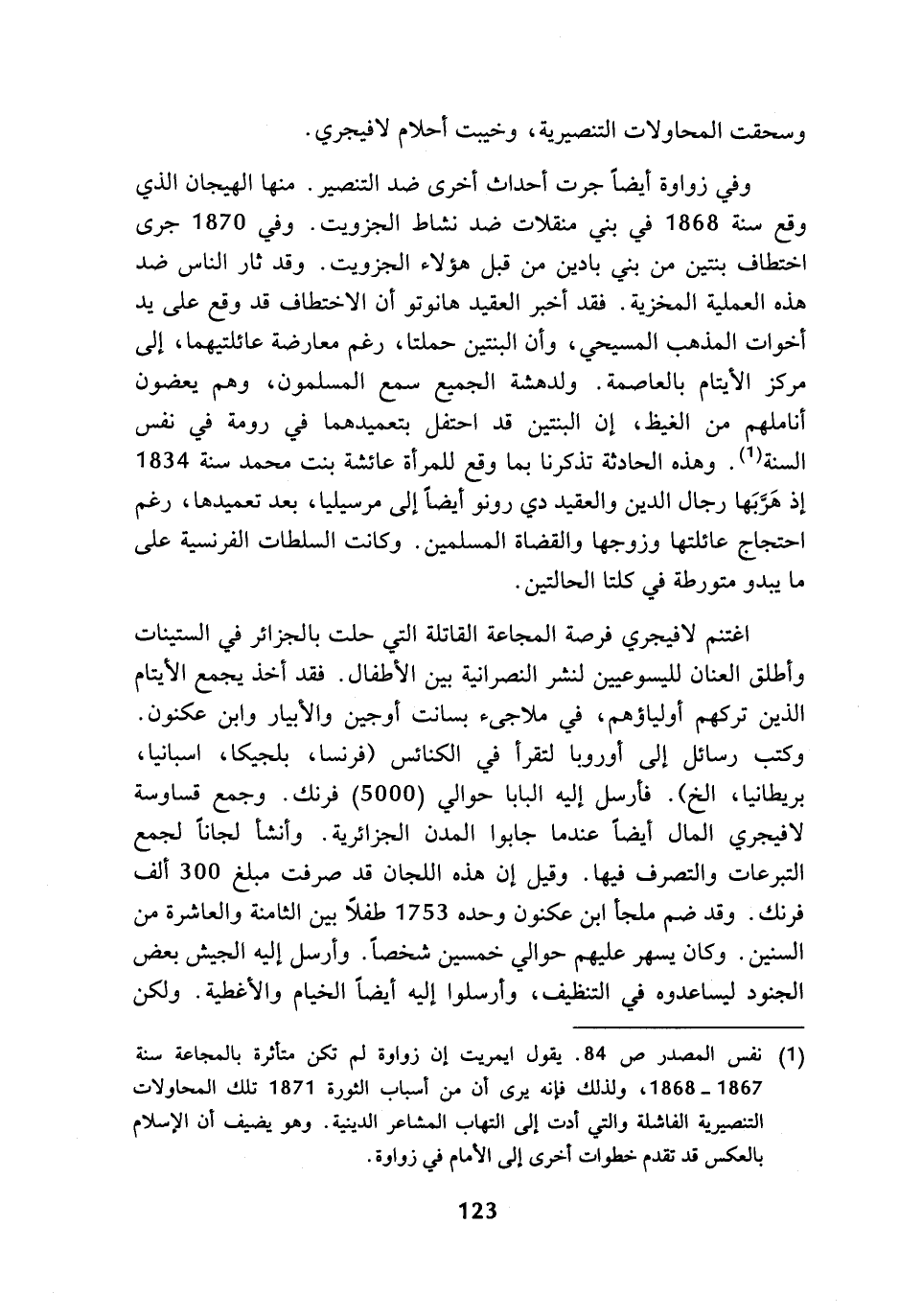 (¬1) نفس المصدر ص 84. يقول ايمريت إن زواوة لم تكن متأثرة بالمجاعة سنة 1867 - 1868، ولذلك فإنه يرى أن من أسباب الثورة 1871 تلك المحاولات التنصيرية الفاشلة والتي أدت إلى التهاب المشاعر الدينية. وهو يضيف أن الإسلام بالعكس قد تقدم خطوات أخرى إلى الأمام في زواوة.