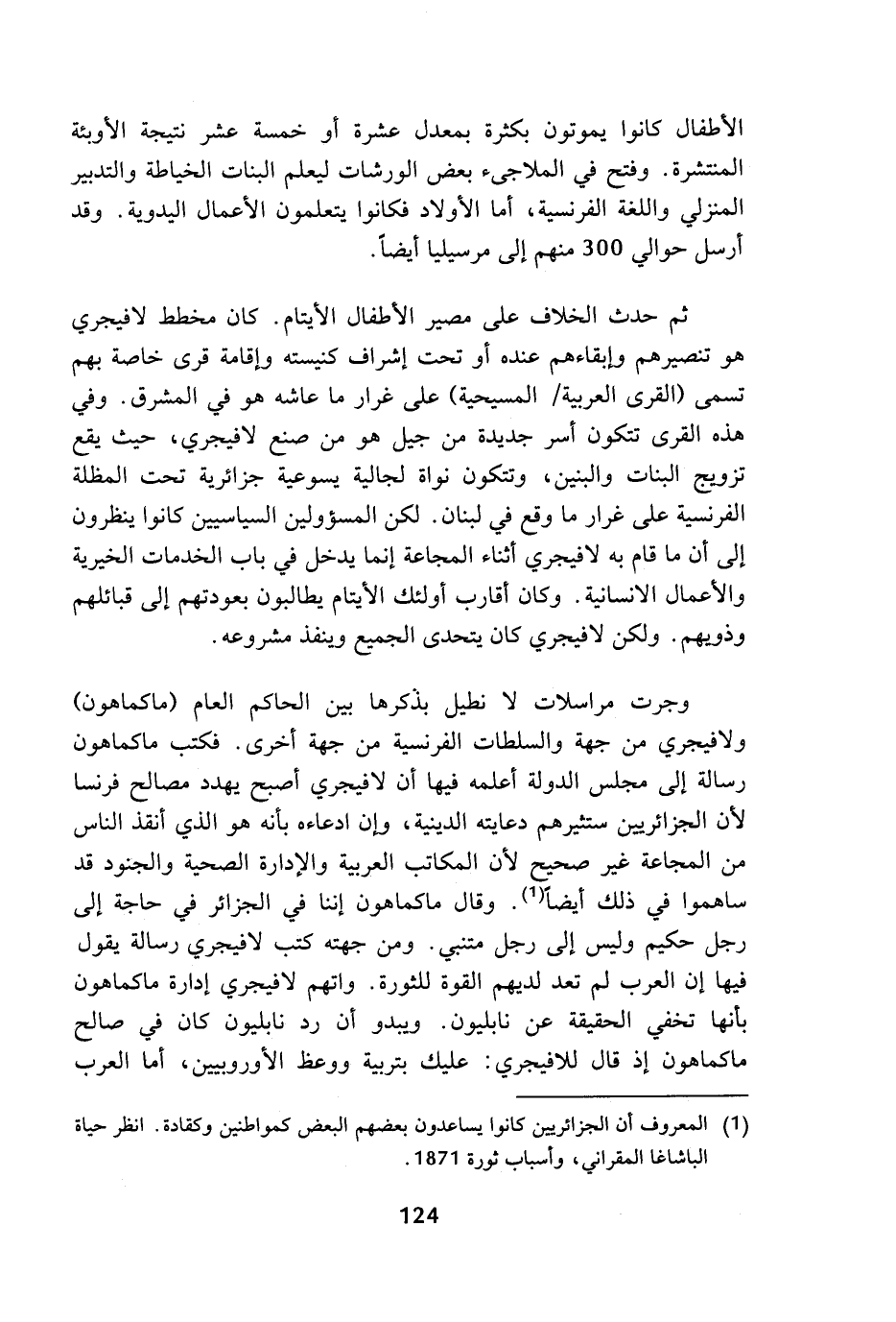 (¬1) المعروف أن الجزائريين كانوا يساعدون بعضهم البعض كمواطنين وكقادة. انظر حياة الباشاغا المقراني، وأسباب ثورة 1871.