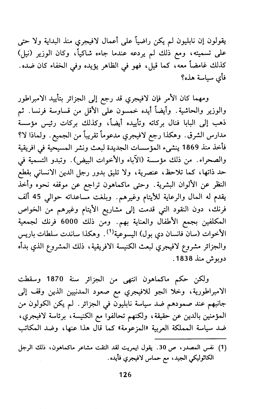 (¬1) نفس المصدر، ص 30. يقول ايمريت لقد التقت مشاعر ماكماهون، ذلك الرجل الكاثوليكي الجيد، مع حماس لافيجري فأيده.