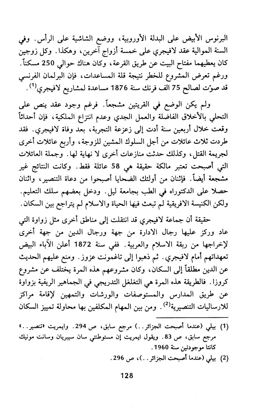 البرنوس الأبيض على البدلة الأوروبية، ووضع الشاشية على الرأس. وفي السنة الموالية عقد لافيجري على خمسة أزواج آخرين، وهكذا. وكل زوجين كان يعطيهما مفتاح البيت عن طريق القرعة، وكان هناك حوالي 250 مسكنا. ورغم تعرض المشروع للخطر نتيجة قلة المساعدات، فإن البرلمان الفرنسي قد صوت لصالح 75 الف فرنك سنة 1876 مساعدة لمشاريع لافيجري (¬1).