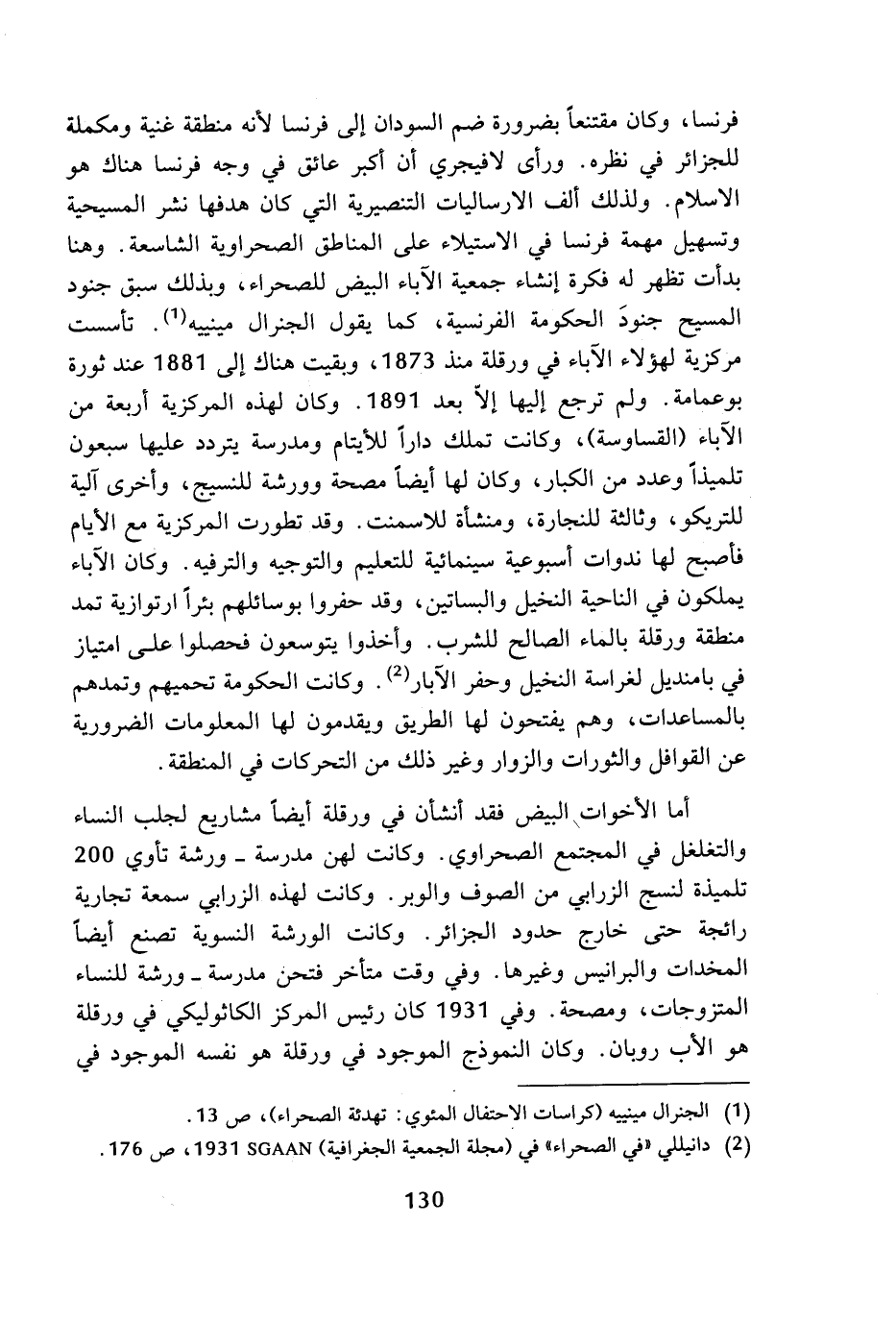 فرنسا، وكان مقتنعا بضرورة ضم السودان إلى فرنسا لأنه منطقة غنية ومكملة للجزائر في نظره. ورأى لافيجري أن أكبر عائق في وجه فرنسا هناك هو الاسلام. ولذلك ألف الارساليات التنصيرية التي كان هدفها نشر المسيحية وتسهيل مهمة فرنسا في الاستيلاء على المناطق الصحراوية الشاسعة. وهنا بدأت تظهر له فكرة إنشاء جمعية الآباء البيض للصحراء، وبذلك سبق جنود المسيح جنود الحكومة الفرنسية، كما يقول الجنرال مينييه (¬1). تأسست مركزية لهؤلاء الآباء في ورقلة منذ 1873، وبقيت هناك إلى 1881 عند ثورة بوعمامة. ولم ترجع إليها إلا بعد 1891. وكان لهذه المركزية أربعة من الآباء (القساوسة)، وكانت تملك دارا للأيتام ومدرسة يتردد عليها سبعون تلميذا وعدد من الكبار، وكان لها أيضا مصحة وورشة للنسيج، وأخرى آلية للتريكو، وثالثة للنجارة، ومنشأة للاسمنت. وقد تطورت المركزية مع الأيام فأصبح لها ندوات أسبوعية سينمائية للتعليم والتوجيه والترفيه. وكان الآباء يملكون في الناحية النخيل والبساتين، وقد حفروا بوسائلهم بئرا ارتوازية تمد منطقة ورقلة بالماء الصالح للشرب. وأخذوا يتوسعون فحصلوا على امتياز في بامنديل لغراسة النخيل وحفر الآبار (¬2). وكانت الحكومة تحميهم وتمدهم بالمساعدات، وهم يفتحون لها الطريق ويقدمون لها المعلومات الضرورية عن القوافل والثورات والزوار وغير ذلك من التحركات في المنطقة.
