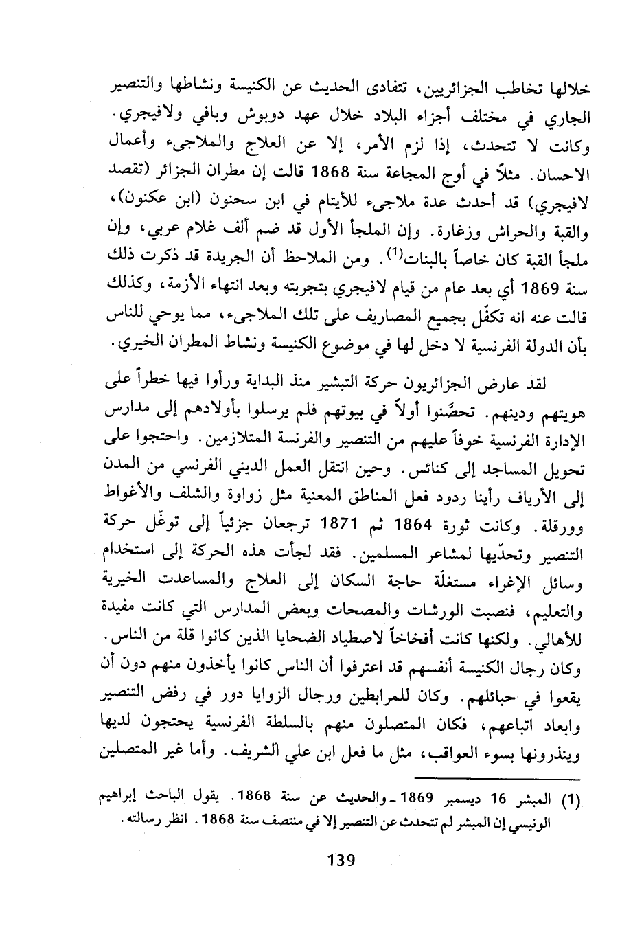 خلالها تخاطب الجزائريين، تتفادى الحديث عن الكنيسة ونشاطها والتنصير الجاري في مختلف أجزاء البلاد خلال عهد دوبوشں وبافي ولافيجري. وكانت لا تتحدث، إذا لزم الأمر، إلا عن العلاج والملاجئ وأعمال الاحسان. مثلا في أوج المجاعة سنة 1868 قالت إن مطران الجزائر (تقصد لافيجري) قد أحدث عدة ملاجئ للأيتام في ابن سحنون (ابن عكنون)، والقبة والحراش وزغارة. وإن الملجأ الأول قد ضم ألف غلام عربي، وإن ملجأ القبة كان خاصا بالبنات (¬1). ومن الملاحظ أن الجريدة قد ذكرت ذلك سنة 1869 أي بعد عام من قيام لافيجري بتجربته وبعد انهاء الأزمة، وكذلك قالت عنه انه تكفل بجميع المصاريف على تلك الملاجئ، مما يوحي للناس بأن الدولة الفرنسية لا دخل لها في موضوع الكنيسة ونشاط المطران الخيري.