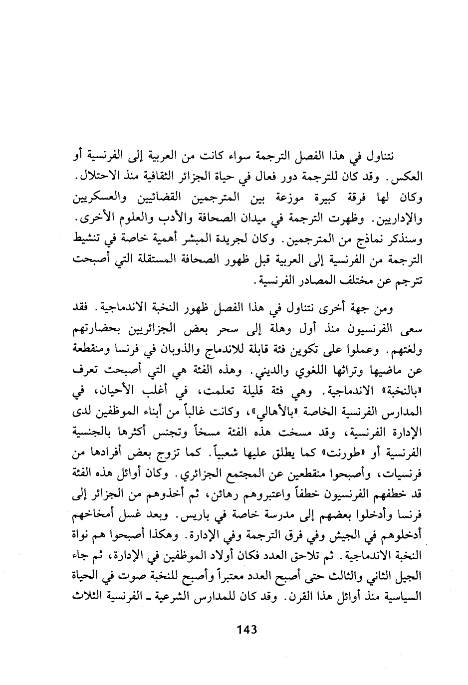 ومن جهة أخرى نتناول في هذا الفصل ظهور النخبة الاندماجية. فقد سعى الفرنسيون منذ أول وهلة إلى سحر بعض الجزائريين بحضارتهم ولغتهم. وعملوا على تكوين فئة قابلة للاندماج والذوبان في فرنسا ومنقطعة عن ماضيها وتراثها اللغوي والديني. وهذه الفئة هي التي أصبحت تعرف (بالنخبة) الاندماجية. وهي فئة قليلة تعلمت، في أغلب الأحيان، في المدارس الفرنسية الخاصة (بالأهالي)، وكانت غالبا من أبناء الموظفين لدى الإدارة الفرنسية، وقد مسخت هذه الفئة مسخا وتجنس أكثرها بالجنسية الفرنسية أو (طورنت) كما يطلق عليها شعبيا. كما تزوج بعض أفرادها من فرنسيات، وأصبحوا منقطعين عن المجتمع الجزائري. وكان أوائل هذه الفئة قد خطفهم الفرنسيون خطفا واعتبروهم رهائن، ثم أخذوهم من الجزائر إلى فرنسا وأدخلوا بعضهم إلى مدرسة خاصة في باريس. وبعد غسل أمخاخهم أدخلوهم في الجيش وفي فرق الترجمة وفي الإدارة. وهكذا أصبحوا هم نواة النخبة الاندماجية. ثم تلاحق العدد فكان أولاد الموظفين في الإدارة، ثم جاء الجيل الثاني والثالث حتى أصبح العدد معتبرا وأصبح للنخبة صوت في الحياة السياسية منذ أوائل هذا القرن. وقد كان للمدارس الشرعية - الفرنسية الثلاث
