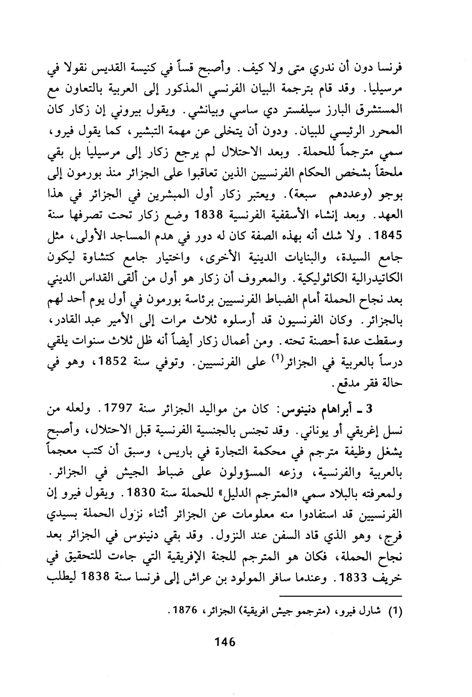 فرنسا دون أن ندري متى ولا كيف. وأصبح قسا في كنيسة القديس نقولا في مرسيليا. وقد قام بترجمة البيان الفرنسي المذكور إلى العربية بالتعاون مع المستشرق البارز سيلفستر دي ساسي وبيانشي. ويقول بيروني إن زكار كان المحرر الرئيسي للبيان. ودون أن يتخلى عن مهمة التبشير، كما يقول فيرو، سمي مترجما للحملة. وبعد الاحتلال لم يرجع زكار إلى مرسيليا بل بقي ملحقا بشخص الحكام الفرنسيين الذين تعاقبوا على الجزائر منذ بورمون إلى بوجو (وعددهم سبعة). ويعتبر زكار أول المبشرين في الجزائر في هذا العهد. وبعد إنشاء الأسقفية الفرنسية 1838 وضع زكار تحت تصرفها سنة 1845. ولا شك أنه بهذه الصفة كان له دور في هدم المساجد الأولى، مثل جامع السيدة، والبنايات الدينية الأخرى، واختيار جامع كتشاوة ليكون الكاتيدرالية الكاثوليكية. والمعروف أن زكار هو أول من ألقى القداس الديني بعد نجاح الحملة أمام الضباط الفرنسيين برئاسة بورمون في أول يوم أحد لهم بالجزائر. وكان الفرنسيون قد أرسلوه ثلاث مرات إلى الأمير عبد القادر، وسقطت عدة أحصنة تحته. ومن أعمال زكار أيضا أنه ظل ثلاث سنوات يلقي درسا بالعربية في الجزائر (¬1) على الفرنسيين. وتوفي سنة 1852، وهو في حالة فقر مدقع.