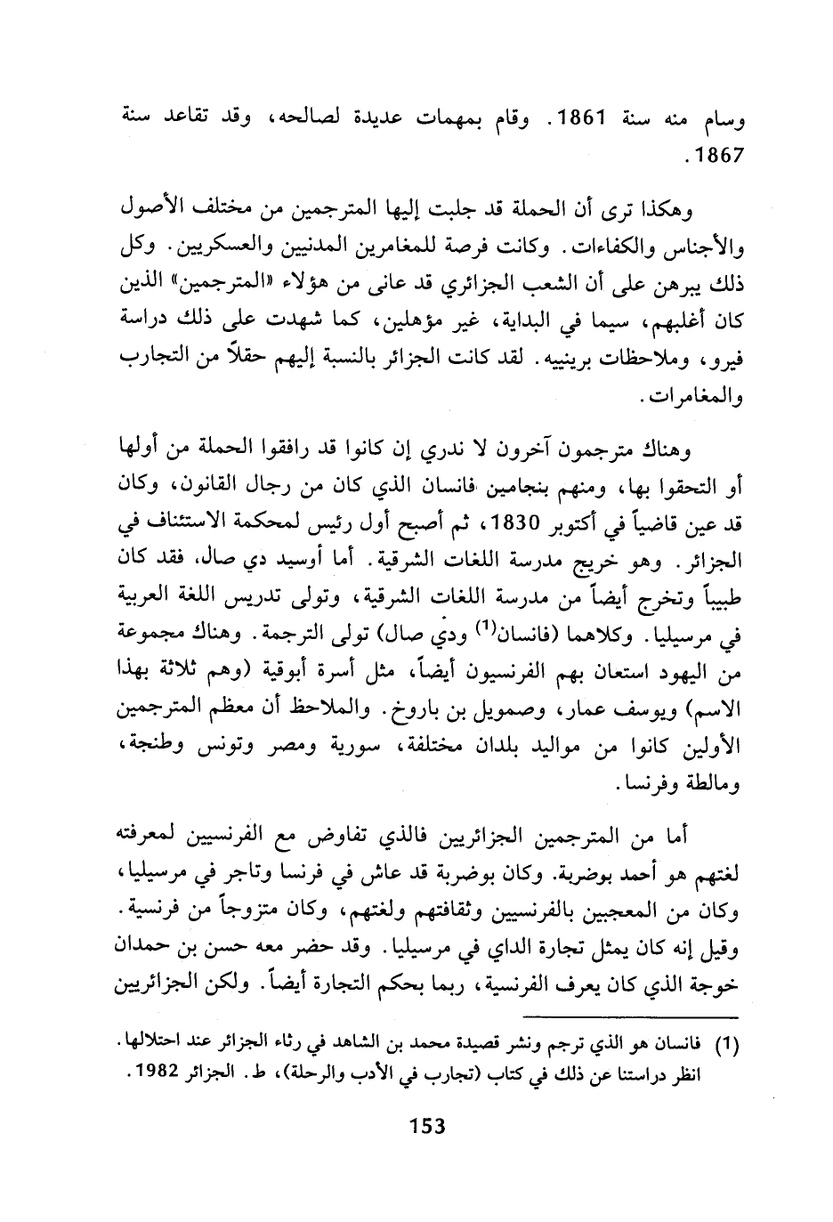 (¬1) فانسان هو الذي ترجم ونشر قصيدة محمد بن الشاهد في رثاء الجزائر عند احتلالها. انظر دراستنا عن ذلك في كتاب (تجارب في الأدب والرحلة)، ط. الجزائر 1982.