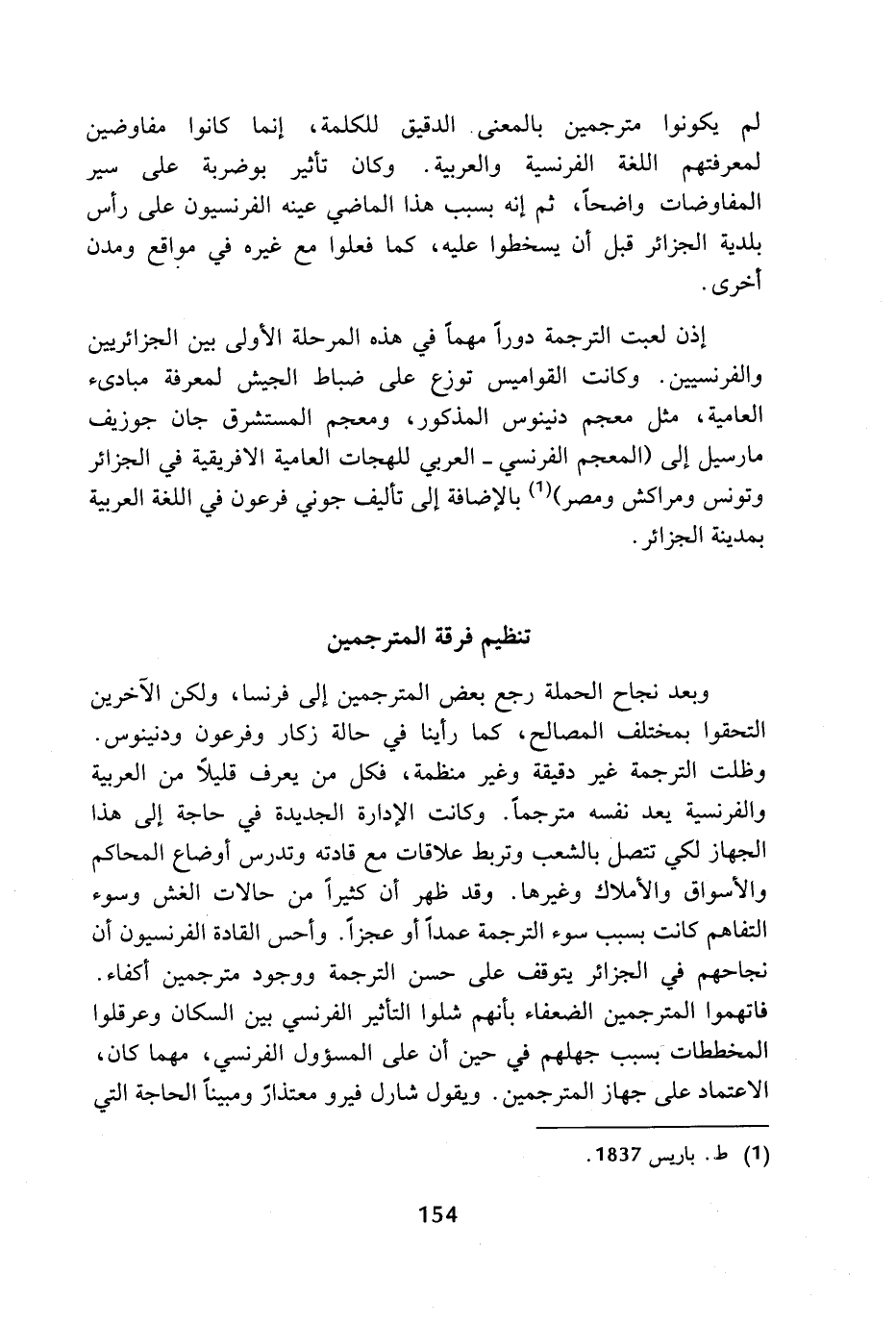 إذن لعبت الترجمة دورا مهما في هذه المرحلة الأولى بين الجزائريين والفرنسيين. وكانت القواميس توزع على ضباط الجيش لمعرفة مبادئ العامية، مثل معجم دنينوس المذكور، ومعجم المستشرق جان جوزيف مارسيل إلى (المعجم الفرنسي - العربي للهجات العامية الافريقية في الجزائر وتونس ومراكش ومصر) (¬1) بالإضافة إلى تأليف جوني فرعون في اللغة العربية بمدينة الجزائر.