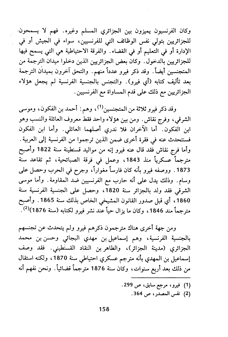وقد ذكر فيرو ثلاثة من المتجنسين (¬1)، وهم: أحمد بن الفكون، وموسى الشرقي، وفرج نقاش. ومن بين هؤلاء واحد فقط معروف العائلة والنسب وهو ابن الفكون. أما الآخران فلا ندري أصلهما العائلي. وأما ابن الفكون فسنتحدث عنه في فقرة أخرى ضمن الذين ترجموا من الفرنسية إلى العربية. وأما فرج نقاش فقد قال عنه فيرو إنه من مواليد قسنطينة سنة 1822 وأصبح مترجما عسكريا منذ 1843، وعمل في فرقة الصبائحية، ثم تقاعد سنة 1873. ووصفه فيرو بأنه كان فارسا مغوارا، وجرح في الحرب وحصل على وسام. وذلك يدل على أنه حارب مع الفرنسيين ضد المقاومة. وأما موسى الشرقي فقد ولد بالجزائر سنة 1820، وحصل على الجنسية الفرنسية سنة 1860، أي قبل صدور القانون المشيخي الخاص بذلك سنة 1865. وأصبح مترجما مند 1846، وكان ما يزال حيا عند نشر فيرو لكتابه (سنة 1876) (¬2).