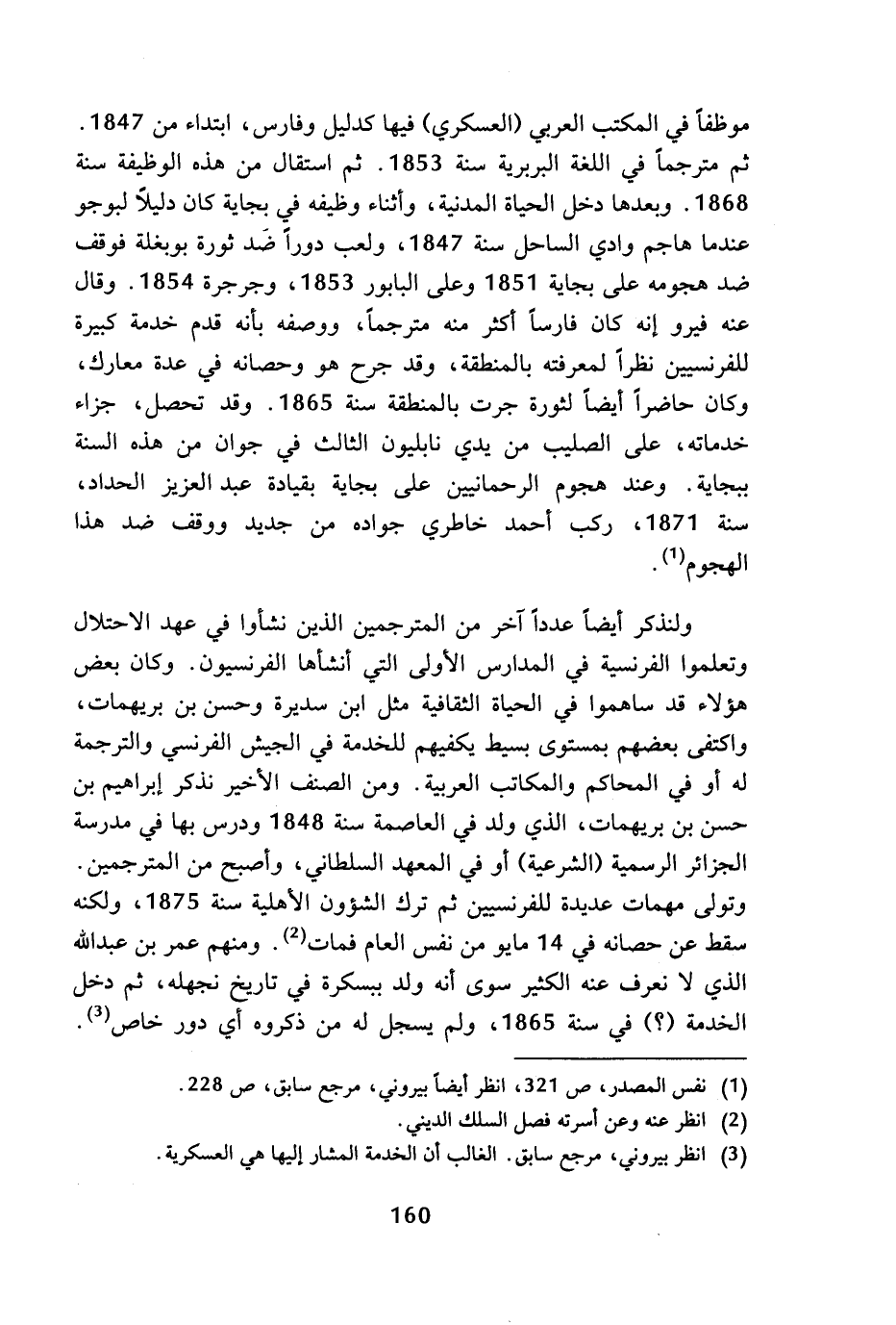 ولنذكر أيضا عددا آخر من المترجمين الذين نشأوا في عهد الاحتلال وتعلموا الفرنسية في المدارس الأولى التي أنشأها الفرنسيون. وكان بعض هؤلاء قد ساهموا في الحياة الثقافية مثل ابن سديرة وحسن بن بريهمات، واكتفى بعضهم بمستوى بسيط يكفيهم للخدمة في الجيش الفرنسي والترجمة له أو في المحاكم والمكاتب العربية. ومن الصنف الأخير نذكر إبراهيم بن حسن بن بريهمات، الذي ولد في العاصمة سنة 1848 ودرس بها في مدرسة الجزائر الرسمية (الشرعية) أو في المعهد السلطاني، وأصبح من المترجمين. وتولى مهمات عديدة للفرنسيين ثم ترك الشؤون الأهلية سنة 1875، ولكنه سقط عن حصانه في 14 مايو من نفس العام فمات (¬2). ومنهم عمر بن عبد الله الذي لا نعرف عنه الكثير سوى أنه ولد ببسكرة في تاريخ نجهله، ثم دخل الخدمة (؟) في سنة 1865، ولم يسجل له من ذكروه أي دور خاص (¬3).