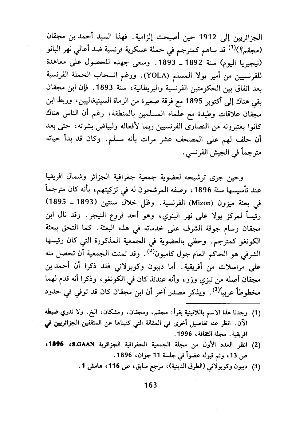 الجزائريين إلى 1912 حين أصبحت إلزامية. فهذا السيد أحمد بن مجقان (مجقم؟) (¬1) قد ساهم كمترجم في حملة عسكرية فرنسية ضد أعالي نهر البانو (نيجيريا اليوم) سنة 1892 - 1893. وسعى جهده للحصول على معاهدة للفرنسيين من أمير يولا المسلم (YOLA). ورغم انسحاب الحملة الفرنسية بعد اتفاق بين الحكومتين الفرنسية والبريطانية، سنة 1893. فإن ابن مجقان بقي هناك إلى أكتوبر 1895 مع فرقة صغيرة من الرماة السينيغاليين، وربط ابن مجقان علاقات وطيدة مع علماء المسلمين بالمنطقة، رغم أن الناس هناك كانوا يعتبرونه من النصارى الفرنسيين ربما لأفعاله ولبياض بشرته، حتى بعد أن حلف لهم على المصحف عشر مرات بأنه مسلم. وكان قد بدأ حياته مترجما في الجيش الفرنسي.