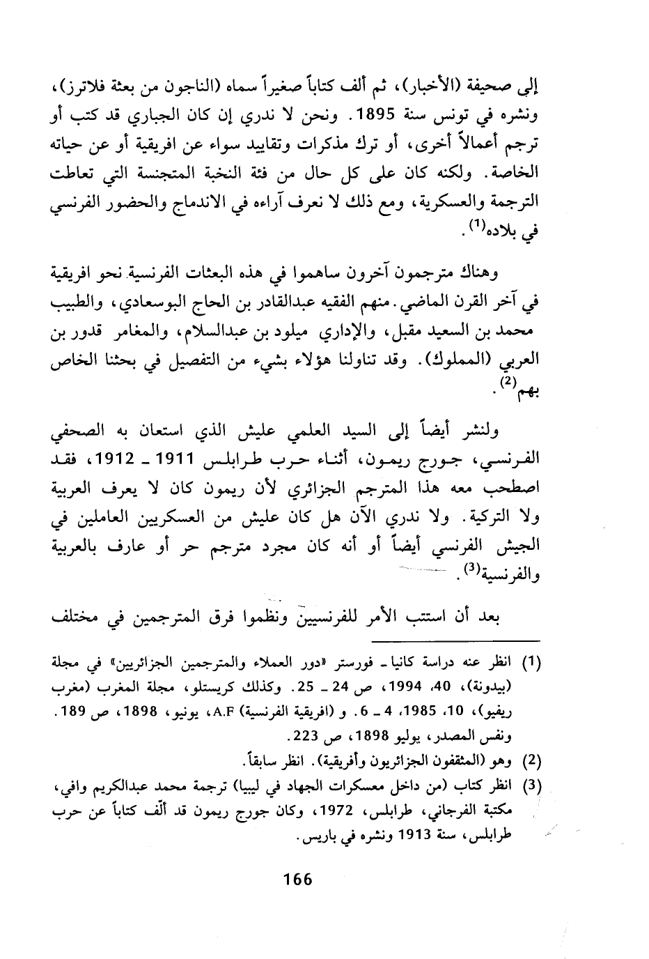 (¬1) انظر عنه دراسة كانيا - فورستر (دور العملاء والمترجمين الجزائريين) في مجلة (بيدونة)، 40، 1994، ص 24 - 25. وكذلك كريستلو، مجلة المغرب (مغرب ريفيو)، 10، 1985، 4 - 6. و (افريقية الفرنسية) A.F، يونيو، 1898، ص 189. ونفس المصدر، يوليو 1898، ص 223.
