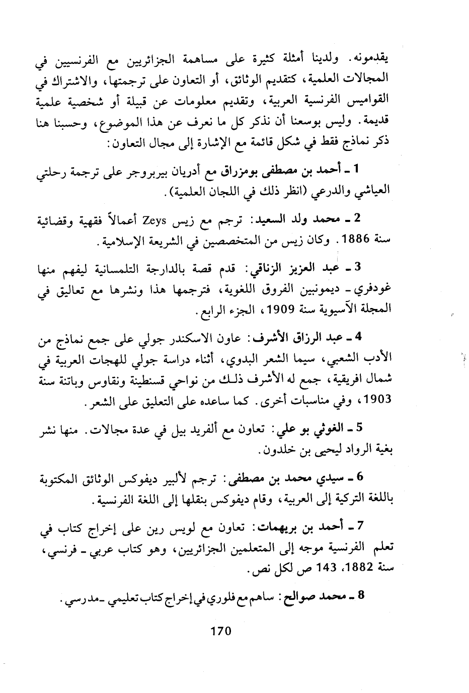 يقدمونه. ولديا أمثلة كثيرة على مساهمة الجزائريين مع الفرنسيين في المجالات العلمية، كتقديم الوثائق، أو التعاون على ترجمتها، والاشتراك في القواميس الفرنسية العربية، وتقديم معلومات عن قبيلة أو شخصية علمية قديمة. وليس بوسعنا أن نذكر كل ما نعرف عن هذا الموضوع، وحسبنا هنا ذكر نماذج فقط في شكل قائمة مع الإشارة إلى مجال التعاون: