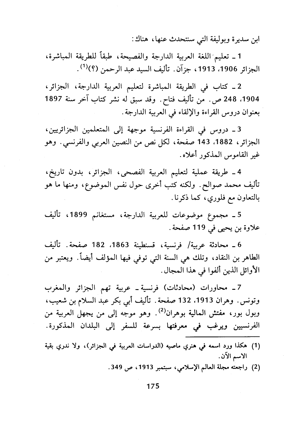 1 - تعليم اللغة العربية الدارجة والفصيحة، طبقا للطريقة المباشرة، الجزائر 1906، 1913، جزآن. تأليف السيد عبد الرحمن (؟) (¬1).