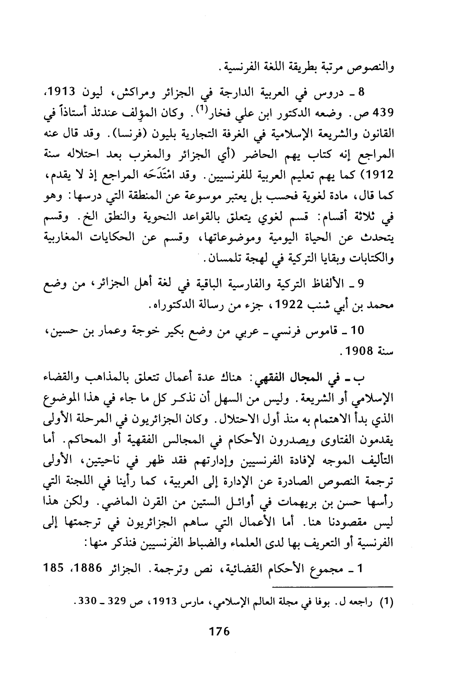 ب - في المجال الفقهي: هناك عدة أعمال تتعلق بالمذاهب والقضاء الإسلامي أو الشريعة. وليس من السهل أن نذكر كل ما جاء في هذا الموضوع الذي بدأ الاهتمام به منذ أول الاحتلال. وكان الجزائريون في المرحلة الأولى يقدمون الفتاوى ويصدرون الأحكام في المجالس الفقهية أو المحاكم. أما التأليف الموجه لإفادة الفرنسيين وإدارتهم فقد ظهر في ناحيتين، الأولى ترجمة النصوص الصادرة عن الإدارة إلى العربية، كما رأينا في اللجنة التي رأسها حسن بن م يهمات في أوائل الستين من القرن الماضي. ولكن هذا ليس مقصودنا هنا. أما الأعمال التي ساهم الجزائريون في ترجمتها إلى الفرنسية أو التعريف بها لدى العلماء والضباط الفرنسيين فنذكر منها: