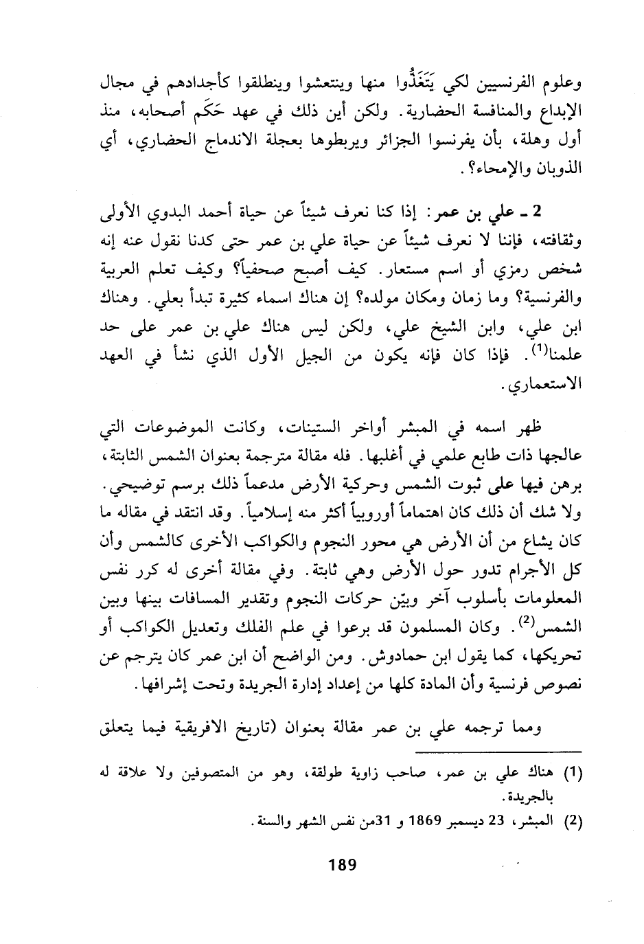 2 - علي بن عمر: إذا كنا نعرف شيئا عن حياة أحمد البدوي الأولى وثقافته، فإننا لا نعرف شيئا عن حياة علي بن عمر حتى كدنا نقول عنه إنه شخص رمزي أو اسم مستعار. كيف أصبح صحفيا؟ وكيف تعلم العربية والفرنسية؟ وما زمان ومكان مولده؟ إن هناك اسماء كثيرة تبدأ بعلي. وهناك ابن علي، وابن الشيخ علي، ولكن ليس هناك علي بن عمر على حد علمنا (¬1). فإذا كان فإنه يكون من الجيل الأول الذي نشأ في العهد الاستعماري.