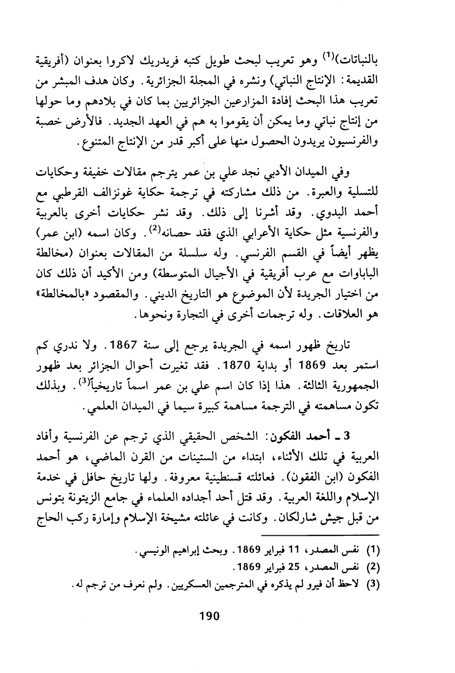 3 - أحمد الفكون: الشخص الحقيقي الذي ترجم عن الفرنسية وأفاد العربية في تلك الأثناء، ابتداء من الستينات من القرن الماضي، هو أحمد الفكون (ابن الفقون). فعائلته قسنطينية معروفة. ولها تاريخ حافل في خدمة الإسلام واللغة العربية. وقد قتل أحد أجداده العلماء في جامع الزيتونة بتونس من قبل جيش شارلكان. وكانت في عائلته مشيخة الإسلام وإمارة ركب الحاج