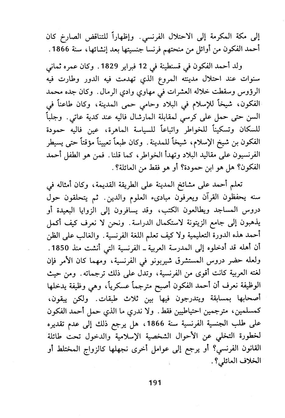 إلى مكة المكرمة إلى الاحتلال الفرنسي. وإظهارا للتناقض الصارخ كان أحمد الفكون من أوائل من منحتهم فرنسا جنسيتها بعد إنشائها، سنة 1866.