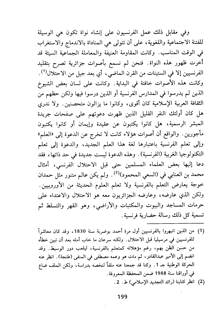 وفي مقابل ذلك عمل الفرنسيون على إنشاء نواة تكون هي الوسيلة للفتنة الاجتماعية واللغوية، على أن تتولى هي المناداة بالاندماج والاستغراب في الوقت المناسب. وكانت المقاومة العنيفة والمعاملة الجماعية السيئة قد أخرت ظهور هذه النواة. فنحن لم نسمع بأصوات جزائرية تصرح بتقليد الفرنسيين إلا في الستينات من القرن الماضي، أي بعد جيل من الاحتلال (¬1). وكانت هذه الأصوات خافتة في البداية. وكانت على لسان بعض الشيوخ الذين لم يدرسوا في المدارس الفرنسية أو الذين درسوا فيها ولكن حظهم من الثقافة العربية الإسلامية كان أقوى، وكانوا ما يزالون متحصنين. ولا ندري هل كان أولئك النفر القليل الذين ظهرت دعوتهم على صفحات جريدة المبشر الرسمية، هل كانوا يكتبون عن عقيدة وإيمان أو كانوا يكتبون مأجورين. والواقع أن أصوات هؤلاء كانت لا تخرج عن الدعوة إلى (العلم) وإلى تعلم الفرنسية باعتبارها لغة هذا العلم الجديد، والدعوة إلى تعلم التكنولوجيا الغربية (الفرنسية). وهذه الدعوة ليست جديدة في حد ذاتها، فقد دعا إليها بعض العلماء المسلمين حتى قبل الاحتلال الفرنسي، أمثال محمد بن العنابي في (السعي المحمود) (¬2). ولم يكن عالم متنور مثل حمدان خوجة يعارض التعلم بالفرنسية ولا تعلم العلوم الحديثة من الأوروبيين. ولكن الذي عارضه، وعارضه الجزائريون معه هو الاحتلال والاعتداء على حرمات المساجد والبيوت والمكتبات والأراضي، وهو القهر والتسلط ثم تسمية كل ذلك رسالة حضارية فرنسية.