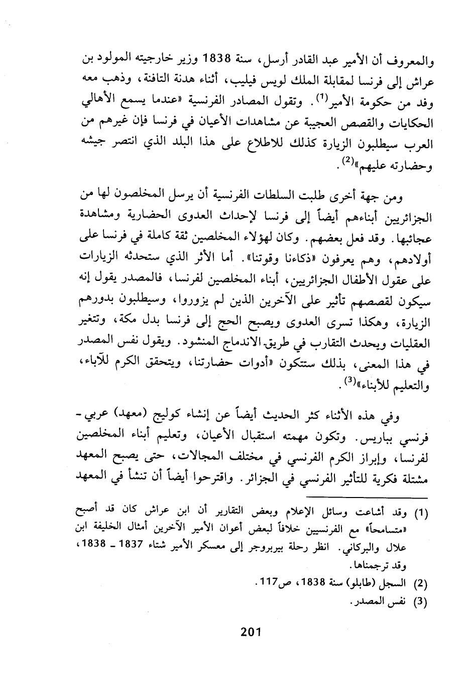 والمعروف أن الأمير عبد القادر أرسل، سنة 1838 وزير خارجيته المولود بن عراش إلى فرنسا لمقابلة الملك لويس فيليب، أثناء هدنة التافنة، وذهب معه وفد من حكومة الأمير (¬1). وتقول المصادر الفرنسية (عندما يسمع الأهالي الحكايات والقصص العجيبة عن مشاهدات الأعيان في فرنسا فإن غيرهم من العرب سيطلبون الزيارة كذلك للاطلاع على هذا البلد الذي انتصر جيشه وحضارته عليهم) (¬2).