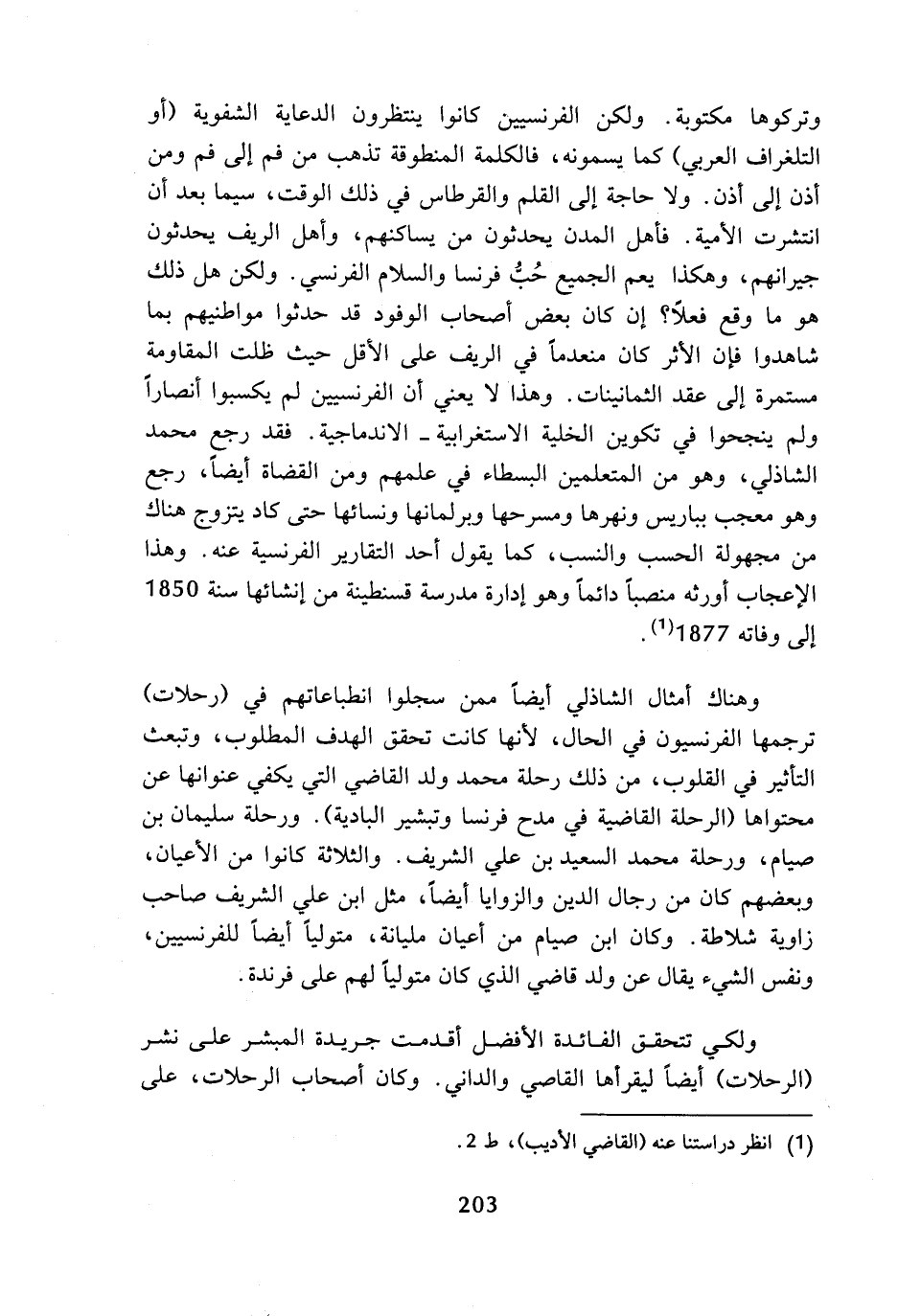 وهناك أمثال الشاذلي أيضا ممن سجلوا انطباعاتهم في (رحلات) ترجمها الفرنسيون في الحال، لأنها كانت تحقق الهدف المطلوب، وتبعث التأثير في القلوب، من ذلك رحلة محمد ولد القاضي التي يكفي عنوانها عن محتواها (الرحلة القاضية في مدح فرنسا وتبشير البادية). ورحلة سليمان بن صيام، ورحلة محمد السعيد بن علي الشريف. والثلاثة كانوا من الأعيان، وبعضهم كان من رجال الدين والزوايا أيضا، مثل ابن علي الشريف صاحب زاوية شلاطة. وكان ابن صيام من أعيان مليانة، متوليا أيضا للفرنسيين، ونفس الشيء يقال عن ولد قاضي الذي كان متوليا لهم على فرندة.