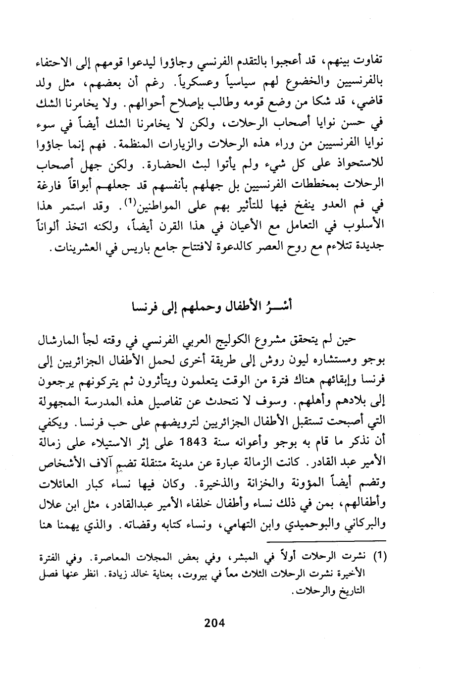 تفاوت بينهم، قد أعجبوا بالتقدم الفرنسي وجاؤوا ليدعوا قومهم إلى الاحتفاء بالفرنسيين والخضوع لهم سياسيا وعسكريا. رغم أن بعضهم، مثل ولد قاضي، قد شكا من وضع قومه وطالب بإصلاح أحوالهم. ولا يخامرنا الشك في حسن نوايا أصحاب الرحلات، ولكن لا يخامرنا الشك أيضا في سوء نوايا الفرنسيين من وراء هذه الرحلات والزيارات المنظمة. فهم إنما جاؤوا للاستحواذ على كل شيء ولم يأتوا لبث الحضارة. ولكن جهل أصحاب الرحلات بمخططات الفرنسيين بل جهلهم بأنفسهم قد جعلهم أبواقا فارغة في فم العدو ينفخ فيها للتأثير بهم على المواطنين (¬1). وقد استمر هذا الأسلوب في التعامل مع الأعيان في هذا القرن أيضا، ولكنه اتخذ ألوانا جديدة تتلاءم مع روح العصر كالدعوة لافتتاح جامع باريس في العشرينات.