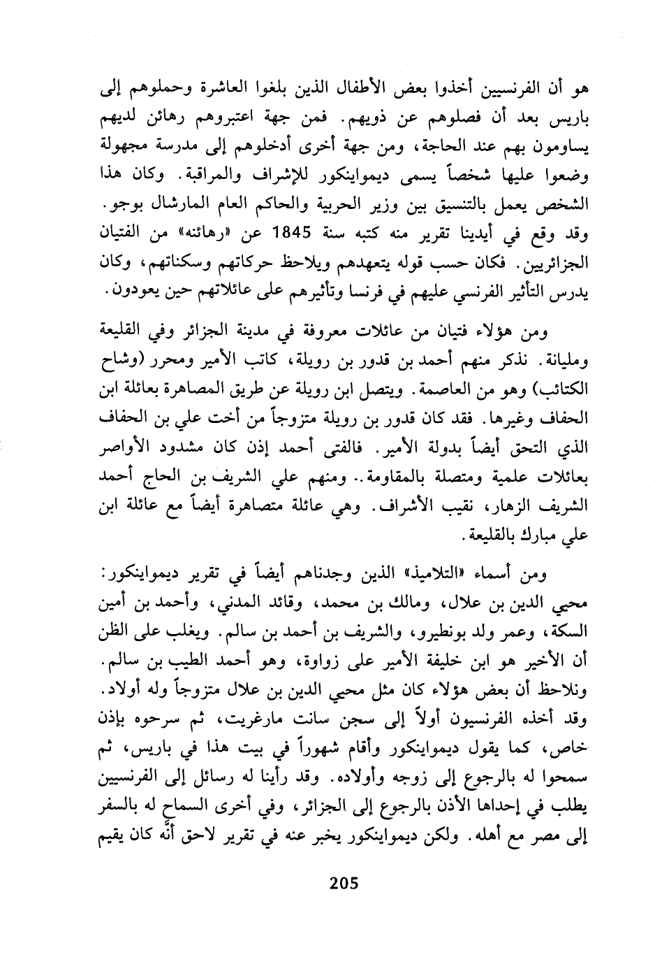 ومن أسماء (التلاميذ) الذين وجدناهم أيضا في تمرير ديمواينكور: محيي الدين بن علال، ومالك بن محمد، وقائد المدني، وأحمد بن أمين السكة، وعمر ولد بونطيرو، والشريف بن أحمد ير سالم. ويغلب على الظن أن الأخير هو ابن خليفة الأمير على زواوة، وهو أحمد الطيب بن سالم. ونلاحظ أن بعض هؤلاء كان مثل محيي الدين بن علال متزوجا وله أولاد. وقد أخذه الفرنسيون أولا إلى سجن سانت مارغريت، ثم سرحوه بإذن خاص، كما يقول ديمواينكور وأقام شهورا في بيت هذا في باريس، ثم سمحوا له بالرجوع إلى زوجه وأولاده. وقد رأينا له رسائل إلى الفرنسيين يطلب في إحداها الأذن بالرجوع إلى الجزائر، وفي أخرى السماح له بالسفر إلى مصر مع أهله. ولكن ديمواينكور يخبر عنه في تقرير لاحق أنه كان يقيم