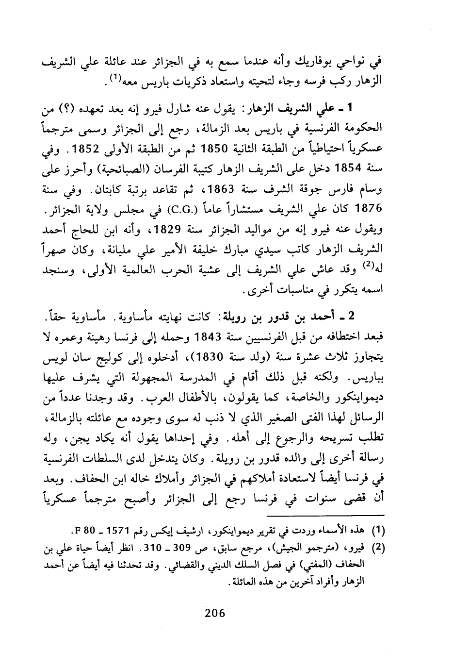 (¬2) فيرو، (مترجمو الجيش)، مرجع سابق، ص 309 - 310. انظر أيضا حياة علي بن الحفاف (المفتي) في فصل السلك الديني والقضائي. وقد تحدثنا فيه أيضا عن أحمد الزهار وأفراد آخرين من هذه العائلة.