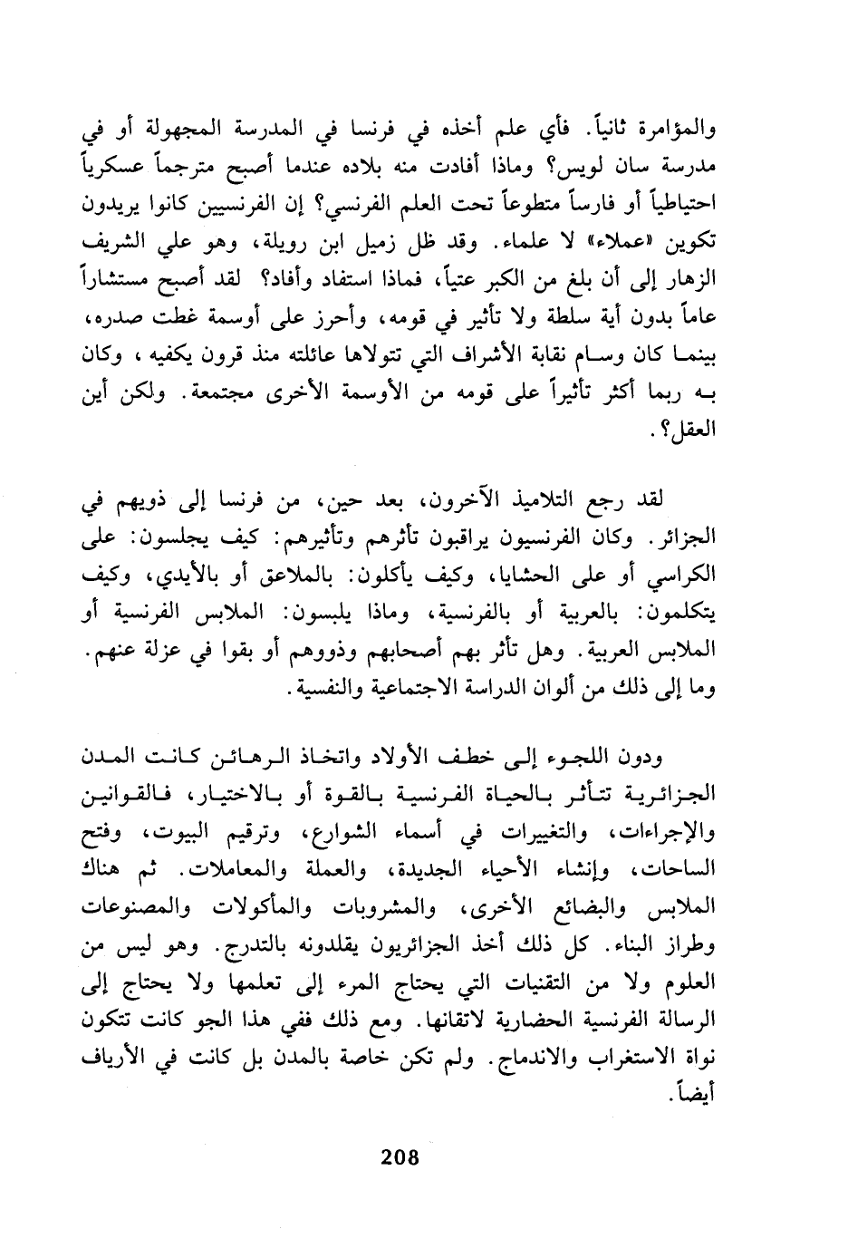 والمؤامرة ثانيا. فأي علم أخذه في فرنسا في المدرسة المجهولة أو في مدرسة سان لويس؟ وماذا أفادت منه بلاده عندما أصبح مترجما عسكريا احتياطيا أو فارسا متطوعا تحت العلم الفرنسي؟ إن الفرنسيين كانوا يريدون تكوين (عملاء) لا علماء. وقد ظل زميل ابن رويلة، وهو علي الشريف الزهار إلى أن بلغ من الكبر عتيا، فماذا استفاد وأفاد؟ لقد أصبح مستشارا عاما بدون أية سلطة ولا تأثير في قومه، وأحرز على أوسمة غطت صدره، بينما كان وسام شابة الأشراف التي تتولاها عائلته منذ قرون يكفيه، وكان به ربما أكثر تأثيرا على قومه من الأوسمة الأخرى مجتمعة. ولكن أن العقل؟.