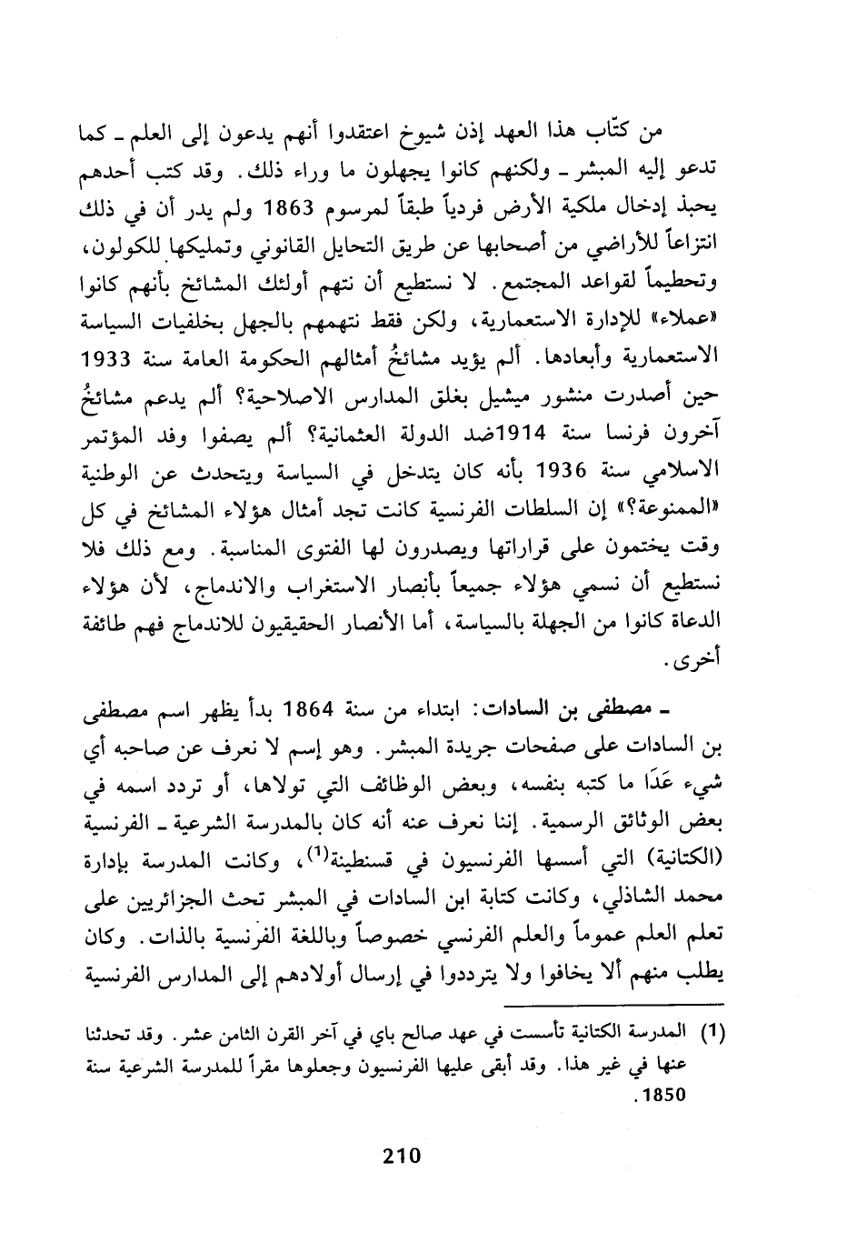 - مصطفى بن السادات: ابتداء من سنة 1864 بدأ يظهر اسم مصطفى بن السادات على صفحات جريدة المبشر. وهو إسم لا نعرف عن صاحبه أي شيء غدا ما كتبه بنفسه، وبعض الوظائف التي تولاها، أو تردد اسمه في بعض الوثائق الرسمية. إننا نعرف عنه أنه كان بالمدرسة الشرعية - الفرنسية (الكتانية) التي أسسها الفرنسيون في قسنطينة (¬1)، وكانت المدرسة بإدارة محمد الشاذلي، وكانت كتابة ابن السادات في المبشر تحث الجزائريين على تعلم العلم عموما والعلم الفرنسي خصوصا وباللغة الفرنسية بالذات. وكان يطلب منهم ألا يخافوا ولا يترددوا في إرسال أولادهم إلى المدارس الفرنسية