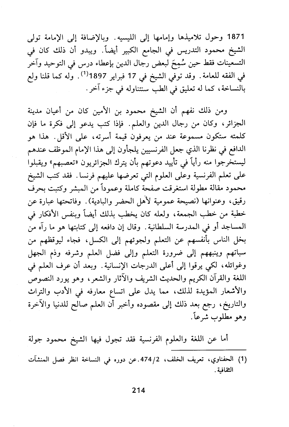 1871 وحول تلاميذها وإمامها إلى الليسيه. وبالإضافة إلى الإمامة تولى الشيخ محمود التدريس في الجامع الكبير أيضا. ويبدو أن ذلك كان في التسعينات فقط حين شيخ لبعض رجال الدين بإعطاء درس في التوحيد وآخر في الفقه للعامة. وقد توفي الشيخ في 17 فبراير 1897 (¬1). وله كما قلنا ولع بالنساخة، كما له تعليق في الطب سنتناوله في جزء آخر.