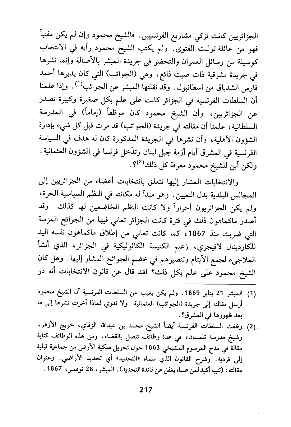 الجزائريين كانت تزكي مشاريع الفرنسيين. فالشيخ محمود وإن لم يكن مفتيا فهو من عائلة تولت الفتوى. ولم يكتب الشيخ محمود رأيه في الانتخاب كوسيلة من وسائل العمران والتحضر في جريدة المبشر بالأصالة وإنما نشرها في جريدة مشرقية ذات صيت ذائع، وهي (الجوائب) التي كان يديرها أحمد فارس الشدياق من اسطانبول. وقد نقلتها المبشر عن الجوائب (¬1). وإذا علمنا أن السلطات الفرنسية في الجزائر كانت على علم بكل صغيرة وكبيرة تصدر عن الجزائريين، وأن الشيخ محمود كان موظفا (إماما) في المدرسة السلطانية، علمنا أن مقالته في جريدة (الجوائب) قد مرت قبل كل شيء بإدارة الشؤون الأهلية، وأن نشرها في الجريدة المذكورة كان له هدف في السياسة الفرنسية في المشرق أيام أزمة جبل لبنان وتدخل فرنسا في الشؤون العثمانية. ولكن أين للشيخ محمود معرفة كل ذلك (¬2)؟.