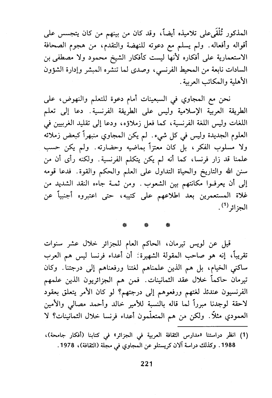 (¬1) انظر دراستنا (مدارس الثقافة العربية في الجزائر) في كتابنا (أفكار جامحة)، 1988. وكذلك دراسة آلان كريستلو عن المجاوي في مجلة (الثقافة)، 1978.