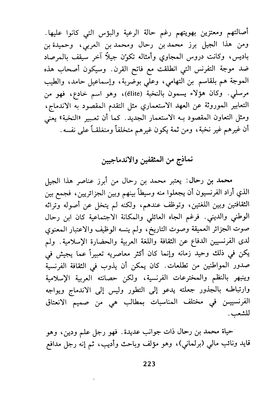 محمد بن رحال: يعتبر محمد بن رحال من أبرز عناصر هذا الجيل الذي أراد الفرنسيون أن يجعلوا منه وسيطا بينهم وبين الجزائريين، فجمع بين الثقافتين وبين اللغتين، وتوظف عندهم، ولكنه لم يتخل عن أصوله وتراثه الوطني والديني. فرغم الجاه العائلي والمكانة الاجتماعية كان ابن رحال صوت الجزائر العميقة وصوت التاريخ، ولم ينسه الوظيف والاعتبار المعنوي لدى الفرنسيين الدفاع عن الثقافة واللغة العربية والحضارة الإسلامية. ولم يكن في ذلك وحيد زمانه وإنما كان أكثر معاصريه تعبيرا عما يجيش في صدور المواطنين من تطلعات. كان يمكن أن يذوب في الثقافة الفرنسية وينبهر بالنظم والمخترعات الفرنسية، ولكن حصانته العربية الإسلامية وارتباطه بالجذور جعلته يدعو إلى التطور وليس إلى الاندماج ويواجه الفرنسيين في مختلف المناسبات بمطالب هي من صميم الانعتاق للشعب.