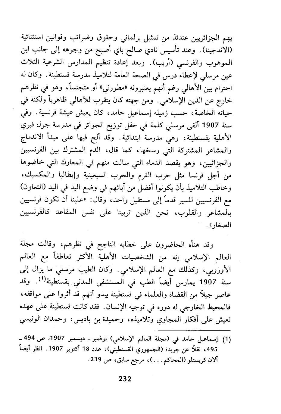 (¬1) إسماعيل حامد في (مجلة العالم الإسلامي) نوفمبر - ديسمبر 1907، ص 494 - 495، نقلا عن جريدة (الجمهوري القسنطيني)، عدد 18 أكتوبر 1907. انظر أيضا آلان كريستلو (المحاكم ...)، مرجع سابق، ص 239.