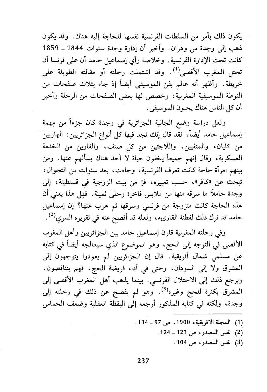 يكون ذلك بأمر من السلطات الفرنسية نفسها للحاجة إليه هناك. وقد يكون ذهب إلى وجدة من وهران. وأخبر أن إدارة وجدة سنوات 1844 - 1859 كانت تحت الإدارة الفرنسية. وخلاصة رأي إسماعيل حامد أن على فرنسا أن تحتل المغرب الأقصى (¬1). وقد اشتملت رحلته أو مقالته الطويلة على خريطة. وأظهر أنه عالم بفن الموسيقى أيضا إذ جاء بثلاث صفحات من النوطة الموسيقية المغربية، وخصص لها بعض الصفحات من الرحلة وأخبر أن كل الناس هناك يحبون الموسيقى.