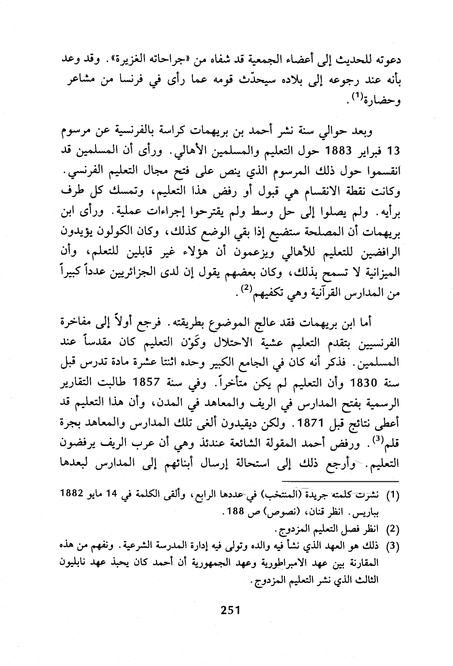 أما ابن بريهمات فقد عالج الموضوع بطريقته. فرجع أولا إلى مفاخرة الفرنسيين بتقدم التعليم عشية الاحتلال وكون التعليم كان مقدسا عند المسلمين. فذكر أنه كان في الجامع الكبير وحده اثنتا عشرة مادة تدرس قبل سنة 1830 وأن التعليم لم يكن متأخرا. وفي سنة 1857 طالبت التقارير الرسمية بفتح المدارس في الريف والمعاهد في المدن، وأن هذا التعليم قد أعطى نتائج قبل 1871. ولكن ديقيدون ألغى تلك المدارس والمعاهد بجرة قلم (¬3). ورفض أحمد المقولة الشائعة عندئذ وهي أن عرب الريف يرفضون التعليم. وأرجع ذلك إلى استحالة إرسال أبنائهم إلى المدارس لبعدها