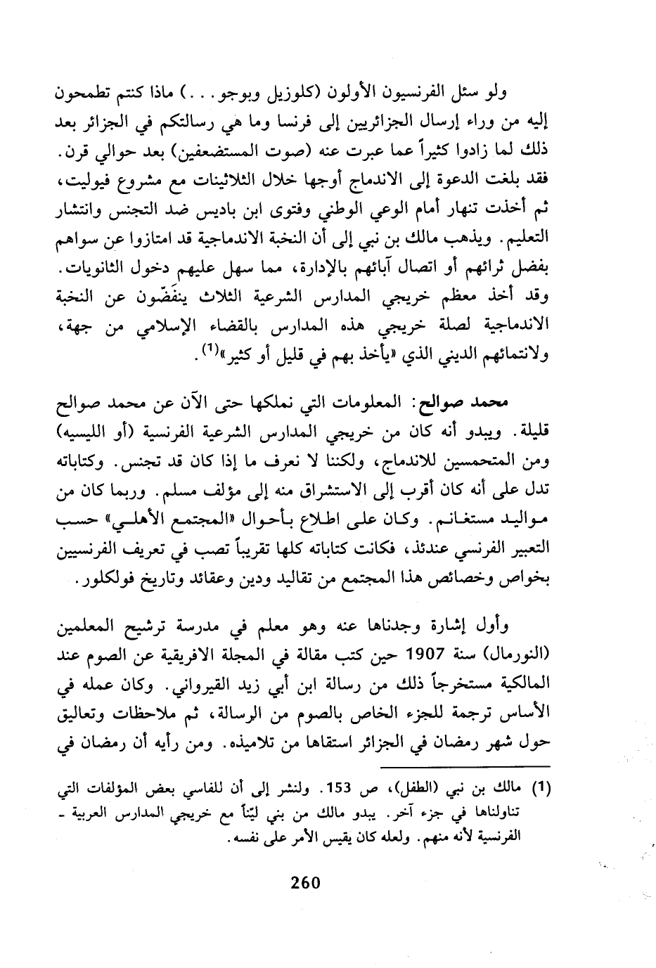(¬1) مالك بن نبي (الطفل)، ص 153. ولنشر إلى أن للفاسي بعض المؤلفات التي تاولناها في جزء آخر. يبدو مالك بن بني لينا مع خريجي المدارس العربية - الفرنسية لأنه منهم. ولعله كان يقيس الأمر على نفسه.