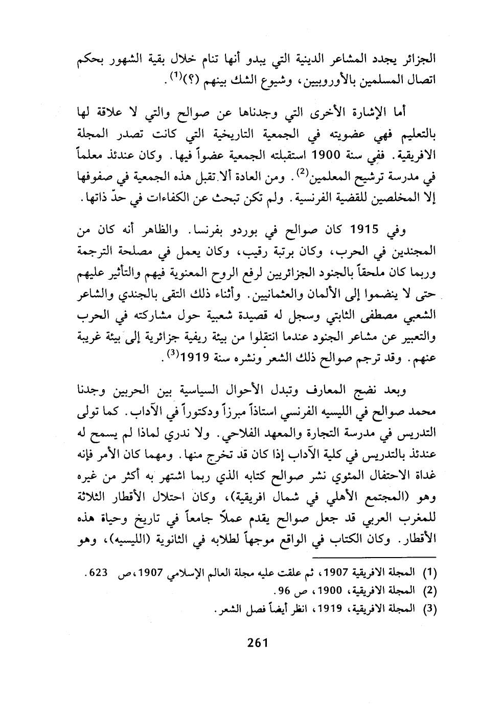 أما الإشارة الأخرى التي وجدناها عن صوالح والتي لا علاقة لها بالتعليم فهي عضويته في الجمعية التاريخية التي كانت تصدر المجلة الافريقية. ففي سنة 1900 استقبلته الجمعية عضوا فيها. وكان عندئذ معلما في مدرسة ترشيح المعلمين (¬2). ومن العادة ألا تقبل هذه الجمعية في صفوفها إلا المخلصين للقضية الفرنسية. ولم تكن تبحث عن الكفاءات في حد ذاتها.