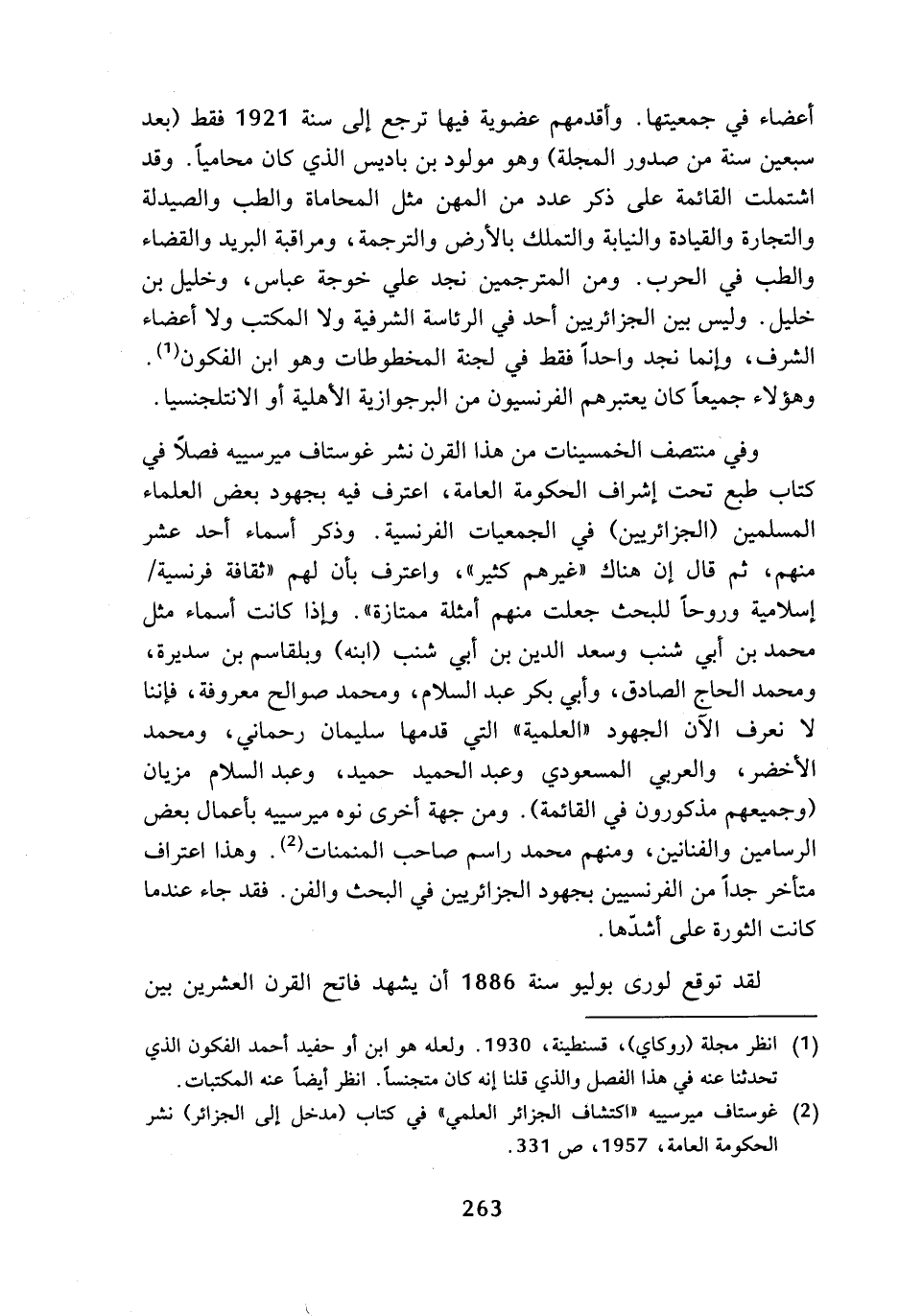 وفي منتصف الخمسينات من هذا القرن نشر غوستاف ميرسييه فصلا في كتاب طبع تحت إشراف الحكومة العامة، اعترف فيه بجهود بعض العلماء المسلمين (الجزائريين) في الجمعيات الفرنسية. وذكر أسماء أحد عشر منهم، ثم قال إن هناك (غيرهم كثير)، واعترف بأن لهم ا (ثقافة فرنسية/ إسلامية وروحا للبحث جعلت منهم أمثلة ممتازة). وإذا كانت أسماء مثل محمد بن أبي شنب وسعد الدين بن أبي شنب (ابنه) وبلقاسم بن سديرة، ومحمد الحاج الصادق، وأبي بكر عبد السلام، ومحمد صوالح معروفة، فإننا لا نعرف الآن الجهود (العلمية) التي قدمها سليمان رحماني، ومحمد الأخضر، والعربي المسعودي وعبد الحميد حميد، وعبد السلام مزيان (وجميعهم مذكورون في القائمة). ومن جهة أخرى نوه ميرسييه بأعمال بعض الرسامين والفنانين، ومنهم محمد راسم صاحب المنمنات (¬2). وهذا اعتراف متأخر جدا من الفرنسيين بجهود الجزائريين في البحث والفن. فقد جاء عندما كانت الثورة على أشدها.
